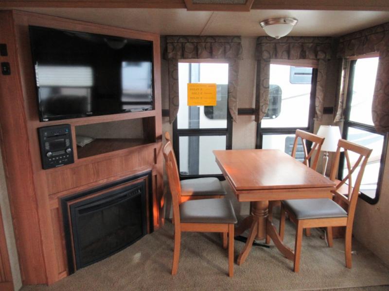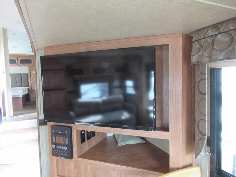 As you enter the fifth wheel, to the left there is a slide with a corner entertainment center, an optional fireplace below and a free-standing dinette. Along the rear wall you will find two recliners or optional Lazy Boy chairs and two end tables. The other slide has a hide-a-bed sofa, overhead cabinet, refrigerator, and three burner range. You will also find a large pantry and microwave. The kitchen island provides extra counter space, bar stools, as well as a large sink which makes clean up a breeze.