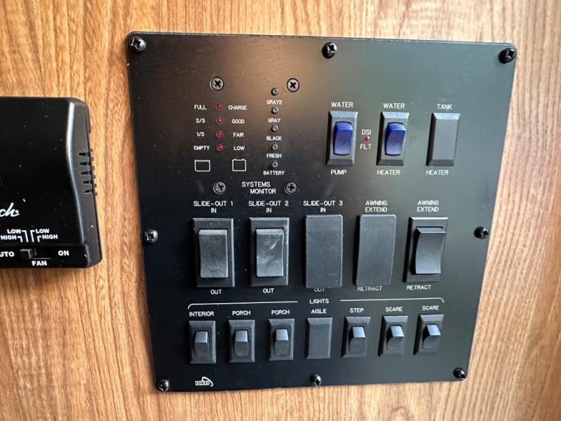As you enter the trailer through the main entrance door, to the right is a refrigerator, three burner range, microwave, angled double kitchen sink, and lots of extra counter space with a shelf along the front. On the road side, the slide has a dinette, or an optional free-standing table with chairs, and a hide-a-bed sofa. Next to the slide you will find an entertainment center. To the left of the entrance there is an entry cabinet, which is ideal for hanging up coats or jackets.