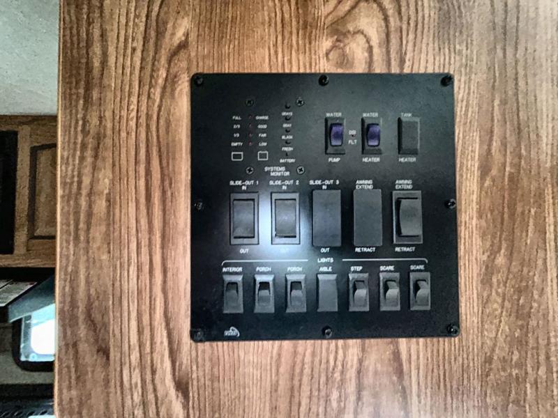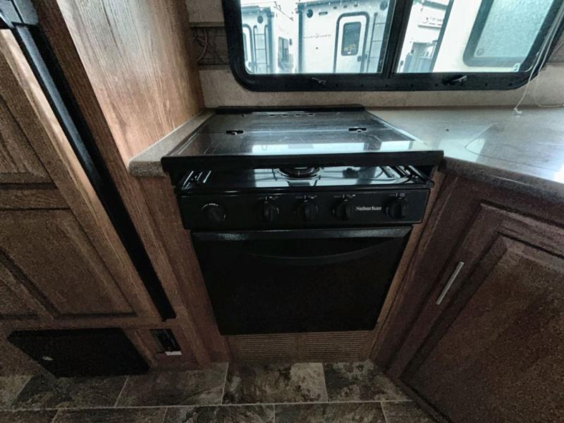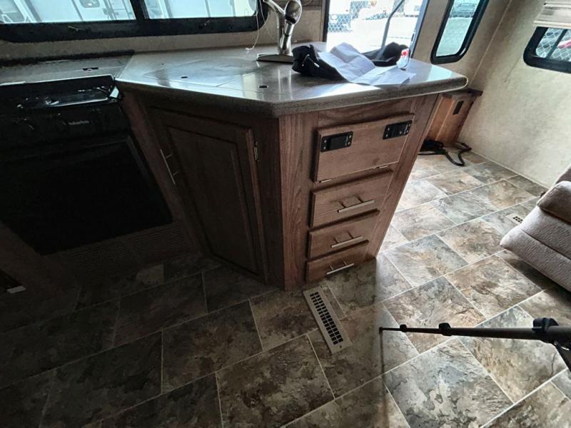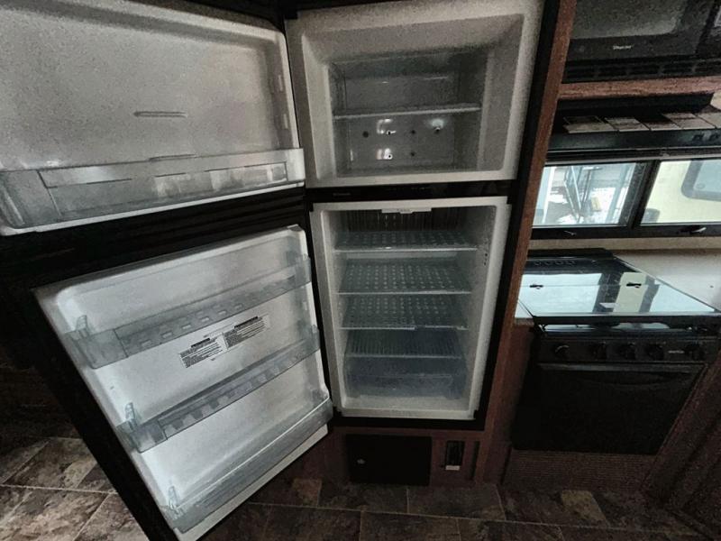 Along the curb side wall, the kitchen area has an angled countertop with a large sink, countertop extension option, overhead cabinets, three burner range, microwave, refrigerator, and a pantry for your non-perishables.