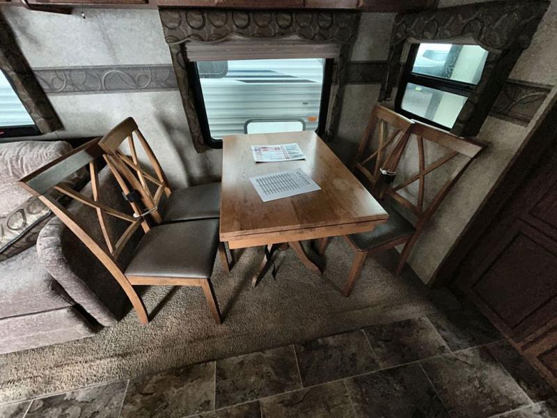 Straight inside a slide out includes a hide-a-bed sofa and a dinette or in place of the sofa and dinette you can choose the Free Standing option. This option includes a sofa or theater seating, plus a free standing table and chairs. You may also choose theater seating in place of the sofa and keep the dinette. Adjacent to the slide there is an entertainment center for easy viewing in this combined space.