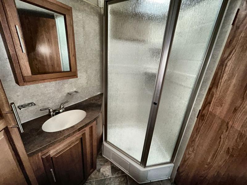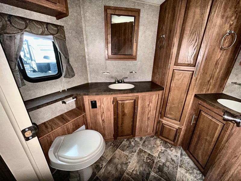 The bathroom is located in the very front of the trailer. Inside the bathroom there is a toilet, his/her sinks, medicine cabinets, linen storage, and a corner shower.