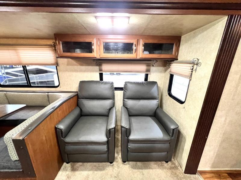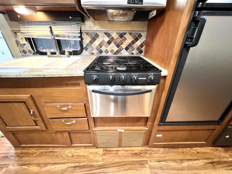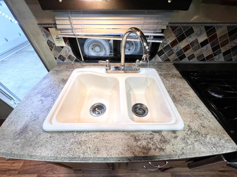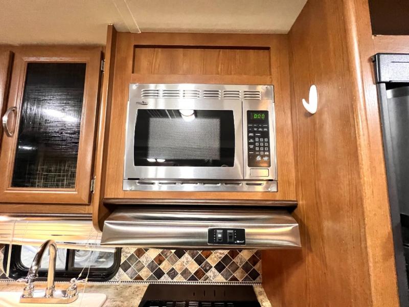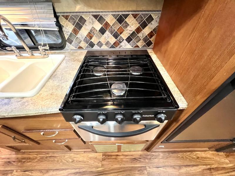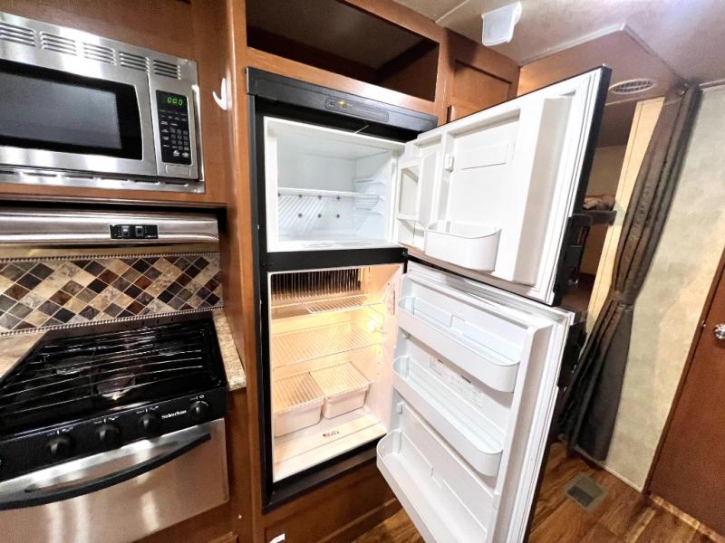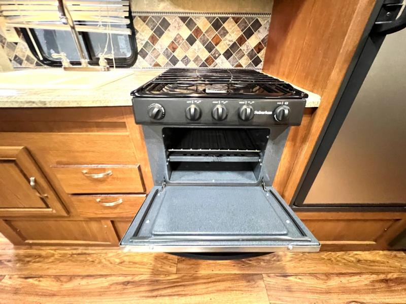 To the left of the entrance you will find a double kitchen sink, three burner range, microwave, refrigerator, and wardrobe with drawers. On the opposite side of the travel trailer there is a slide with a u-dinette and a sofa. Along the front of the living area is a swivel box where you can watch TV.