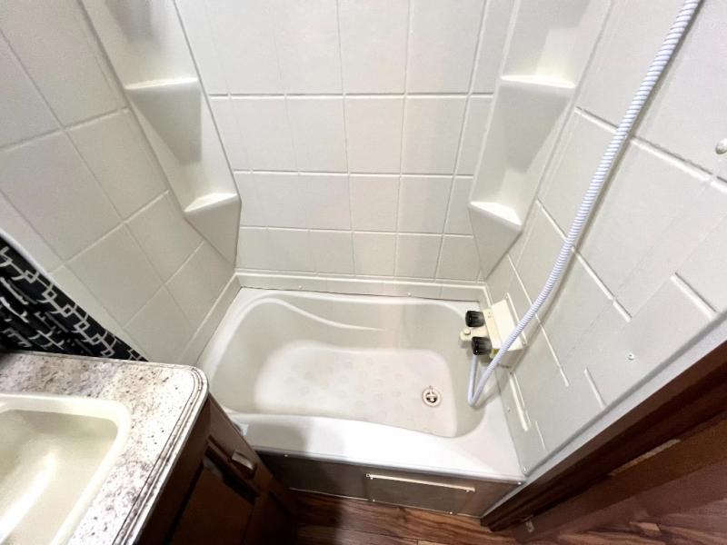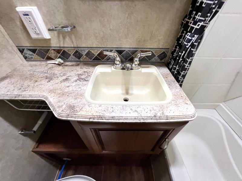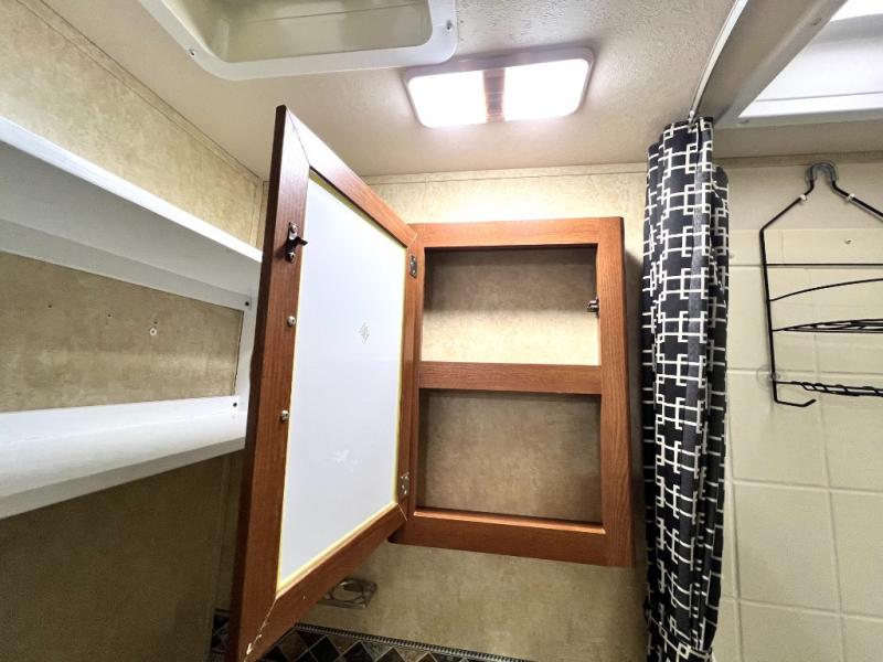 In the rear, you will find a bathroom with a shower/tub, sink, medicine cabinet, and toilet.