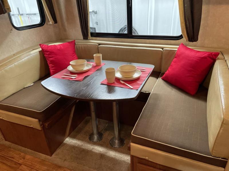 As you enter the travel trailer, to the left is a double kitchen sink, three burner range, microwave, refrigerator, and wardrobe. On the opposite side of the travel trailer you will find a slide with a sofa and a u-dinette. Next to the dinette is a sink with a medicine cabinet.