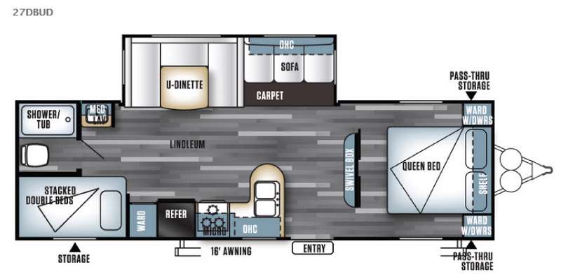 Load up the family in the 27DBUD Salem travel trailer by Forest River and enjoy camping with the single slide, rear bath, and rear set of stacked bunk beds!