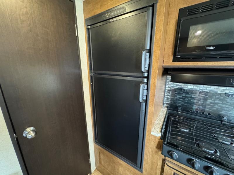As you enter the travel trailer, to the left there is a dinette. On the opposite side of the trailer you will find a refrigerator, three burner range, microwave, and double kitchen sink. There is also a sofa in the main living area.