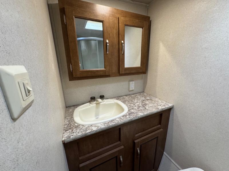 In the rear of the trailer you will find a bathroom with a radius shower, toilet, sink, and medicine cabinet.