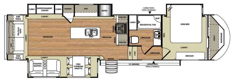 As you enter the fifth wheel, to the left there is a slide with a free-standing table and theater seating. Along the rear wall you can relax on the tri-fold sofa. There are end tables on either side of the sofa. There is another slide on the road side of the fifth wheel which has a curio, entertainment center, pantry, and refrigerator. Next to the slide there are shelves and a three burner range. You are sure to enjoy the convenience of the kitchen island which also has a double kitchen sink.