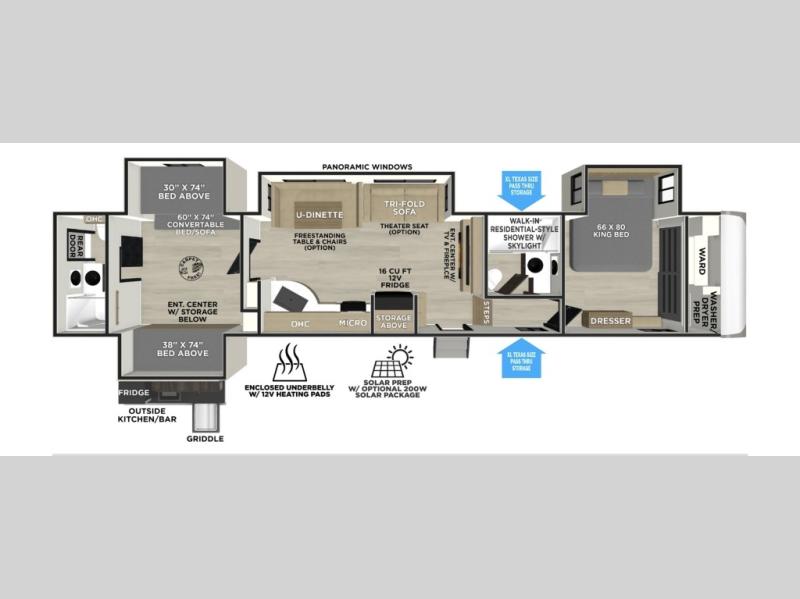 There are plenty of overhead cabinets throughout the fifth wheel as well as a large pass through storage area.