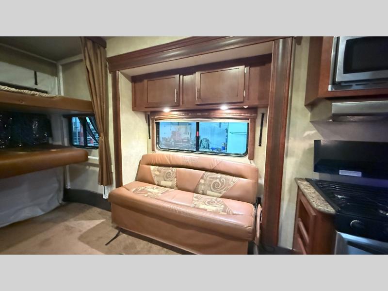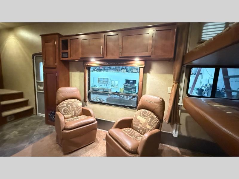 Along the road side, there is a sofa with overhead cabinets and a table. You may choose an optional slide out for the sofa. The opposite side includes two captain chairs with a table between them as well as overhead cabinets. You may choose an optional dinette for this space.