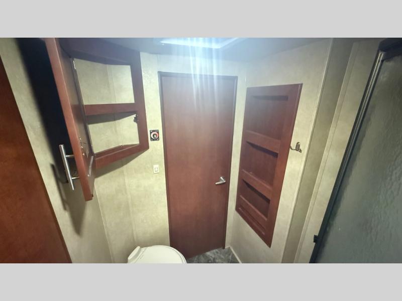 Step into the Forest River Shockwave fifth wheel toy hauler F28SAGDX and up the stairs on your right you will find a full bathroom. It includes a toilet, overhead storage, a corner angled shower with glass door, a vanity sink, and a medicine cabinet. There is a private entry door to the bedroom.