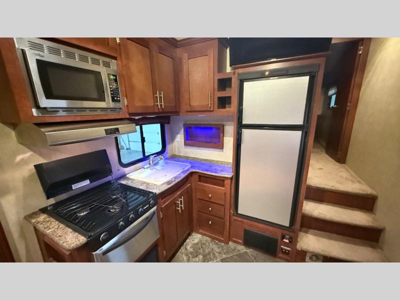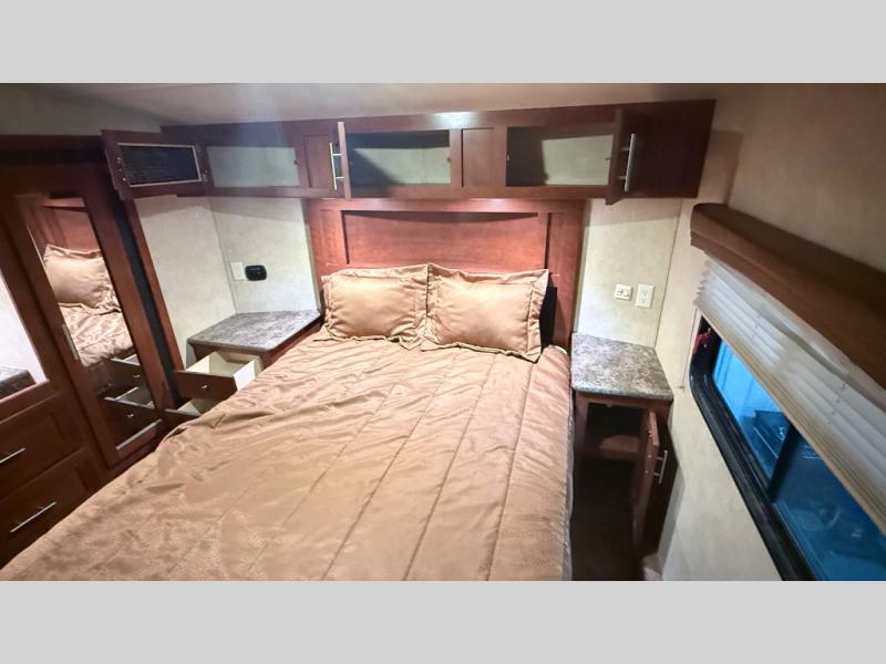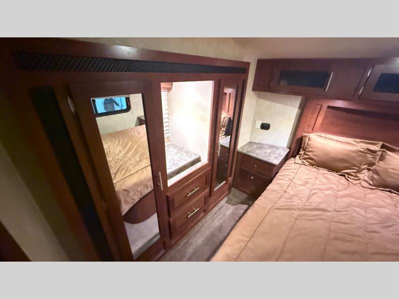 At the front of this fifth wheel toy hauler is the master bedroom including a slide out with two wardrobes and a vanity in the middle. You will also find a queen bed, nightstands at each side and overhead cabinets.