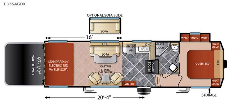 Along the road side, there is a sofa with overhead cabinets and a table. You may choose an optional slide for the sofa. The opposite side includes two captain chairs with a table between them as well as overhead cabinets. Here, you may choose an optional dinette.