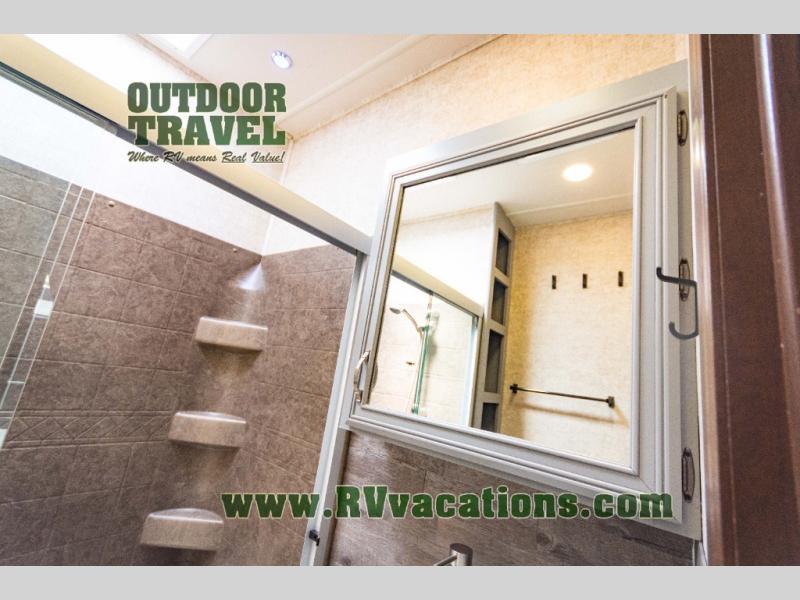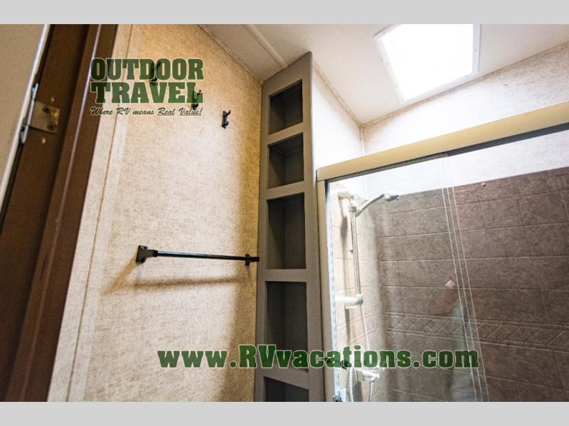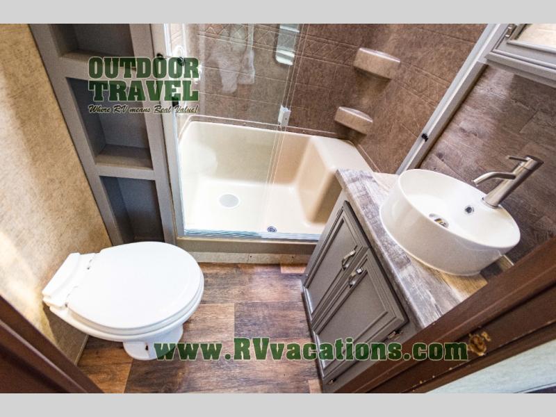 Proceeding toward the rear of the fifth wheel, the bathroom is on the right. Inside the bathroom there is a toilet, linen cabinet which is great storage for towels or toiletries, a walk-in shower with seat, and a sink with medicine cabinet.