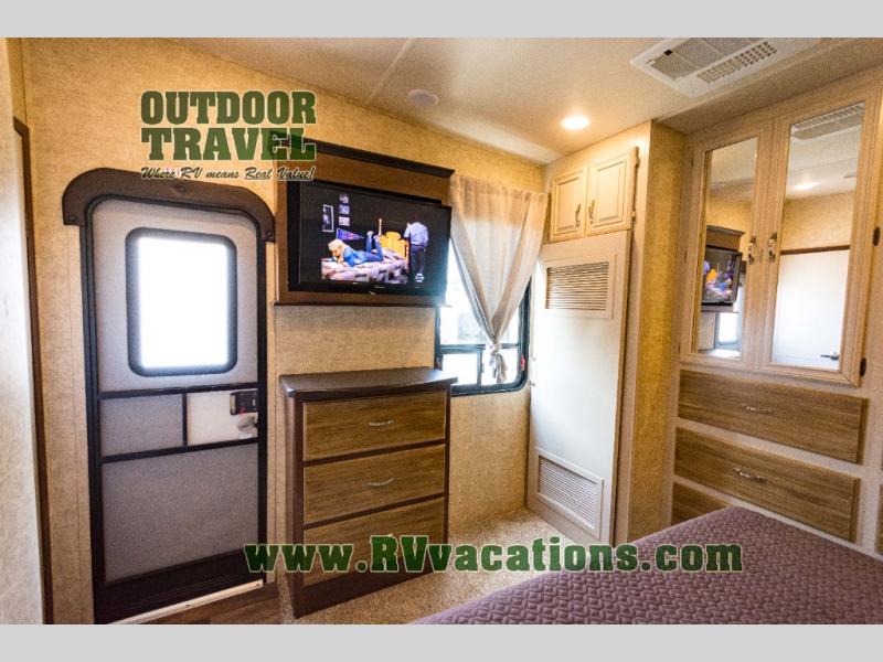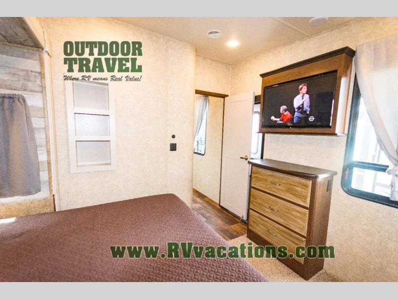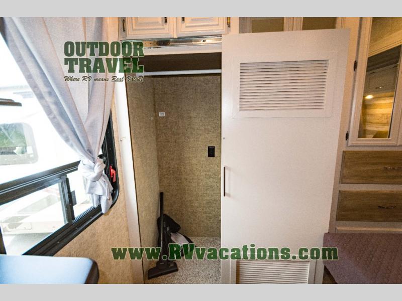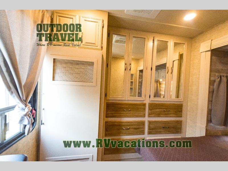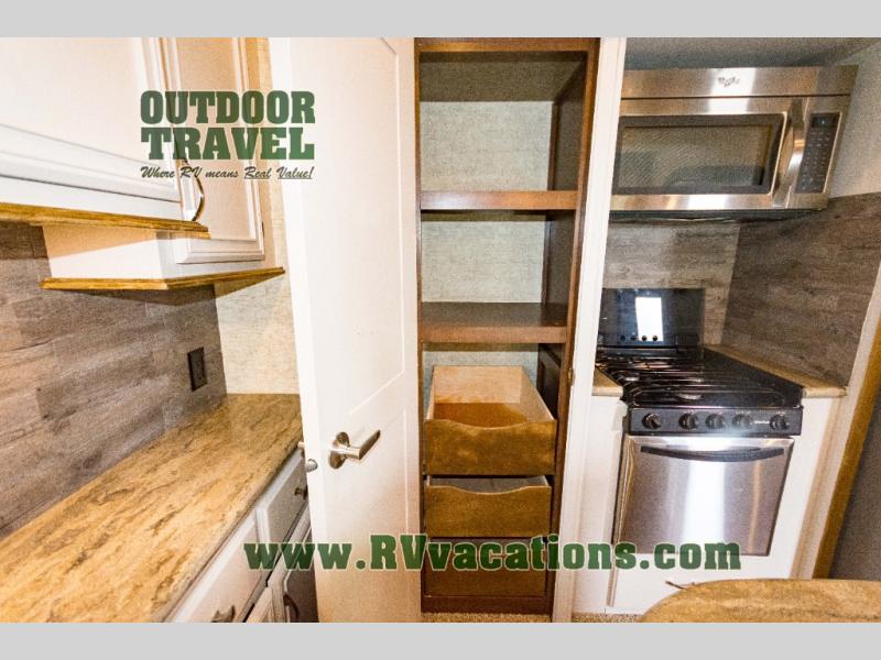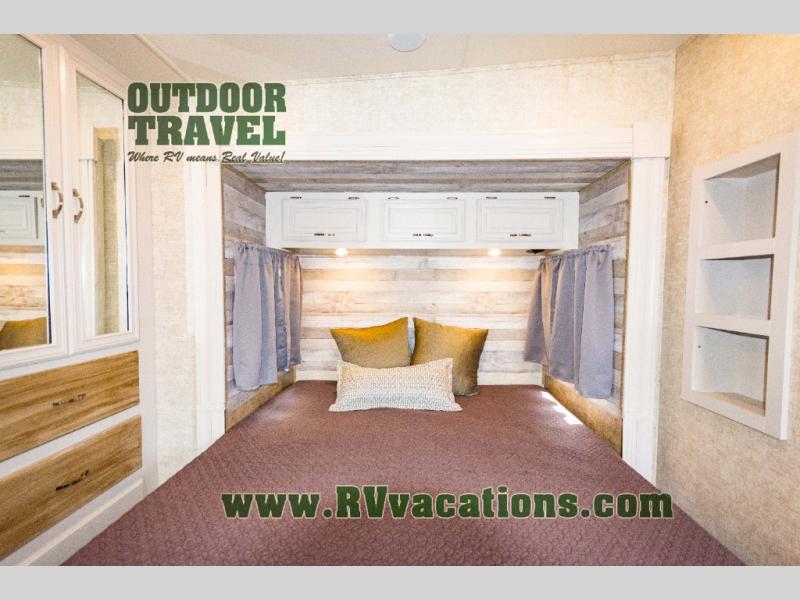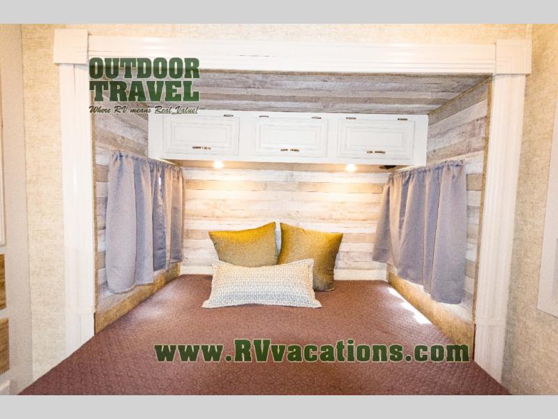The rear bedroom has a slide with a queen bed or you can choose an optional king bed. Across from the bed there is a dresser. Along the rear wall you will find a large wardrobe, and an optional stackable washer and dryer. Next to the dresser there is a private entrance door leading outside, plus so much more!