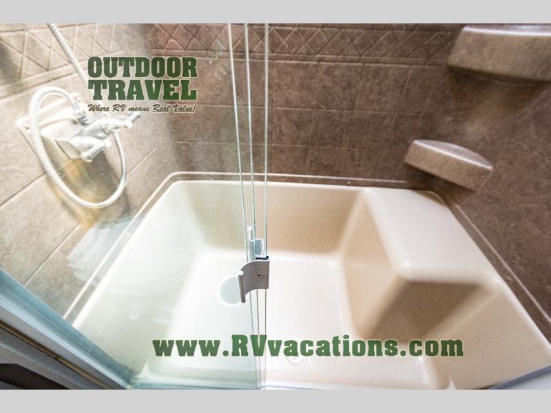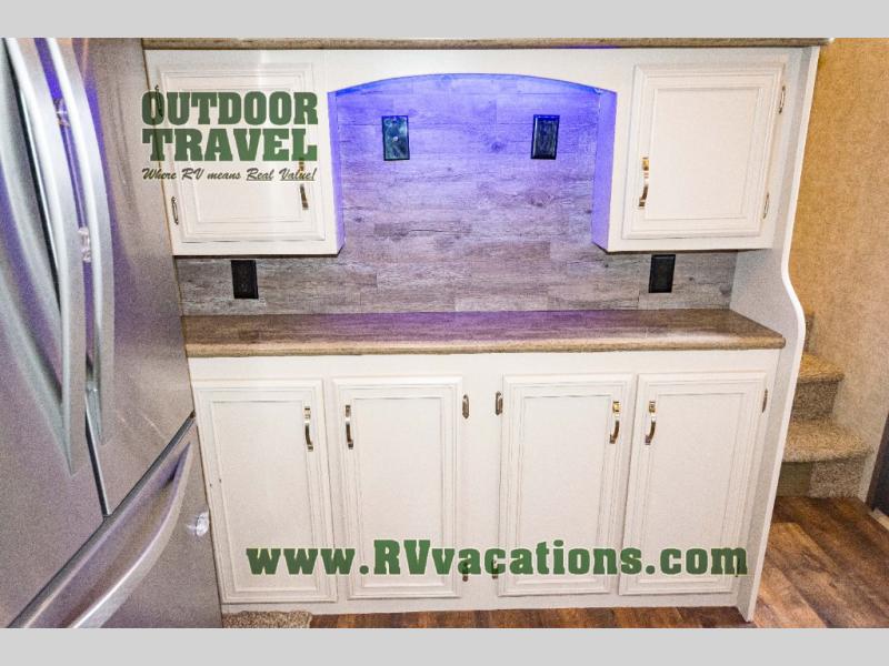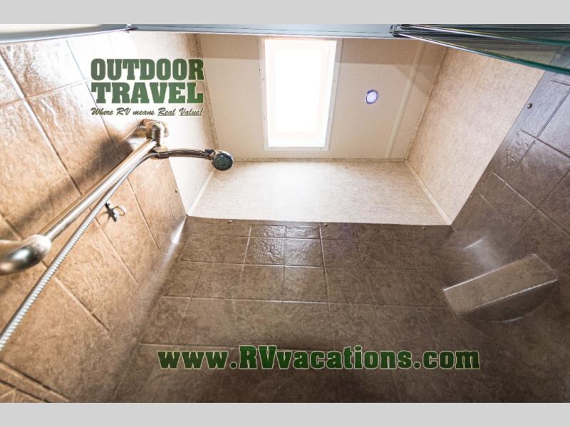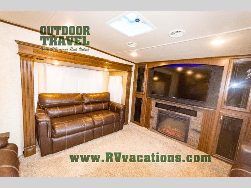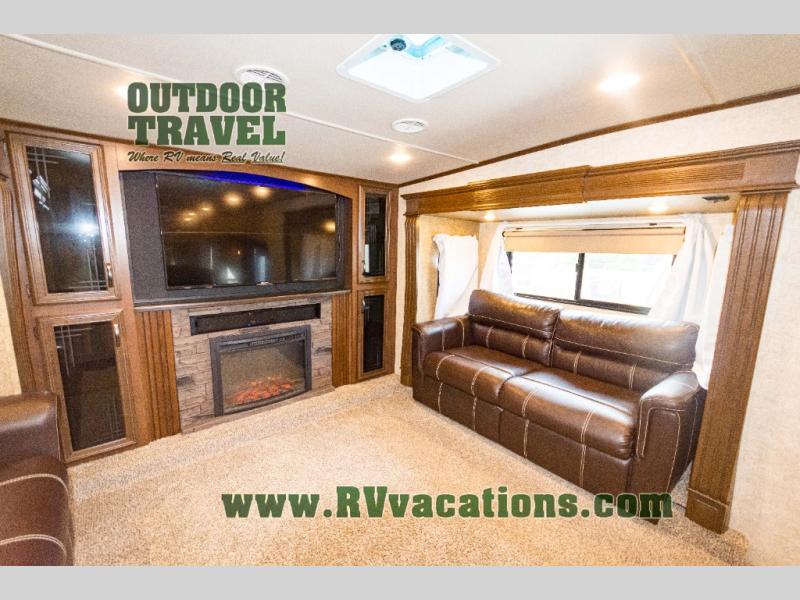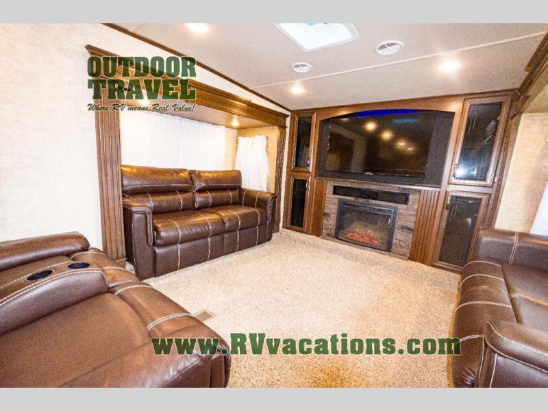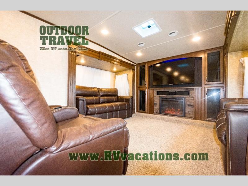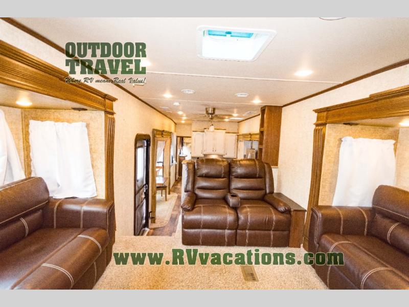 As you step up the stairs you will enter into the front living area. There are two slides and each slide has a tri-fold hide-a-bed sofa. Along the front of the living area you are sure to enjoy the large entertainment center and fireplace. Across from the entertainment center there is more seating with the theater seats.