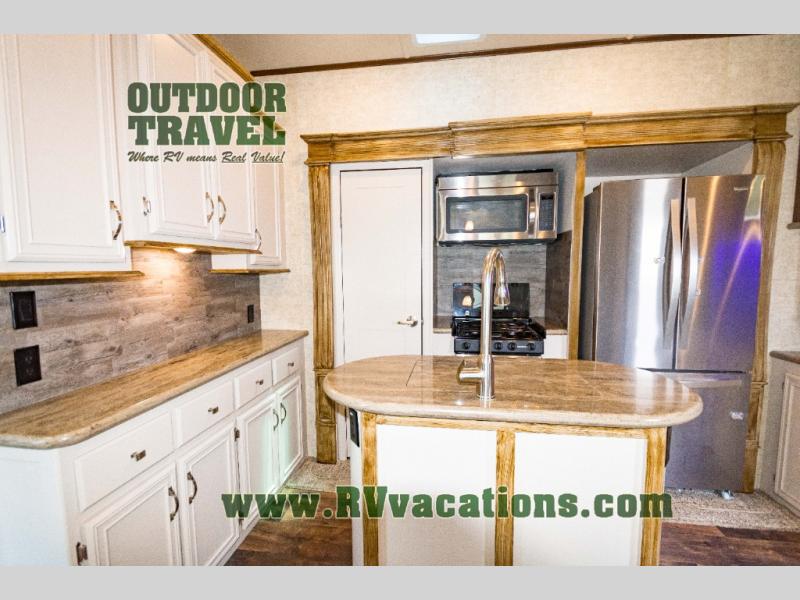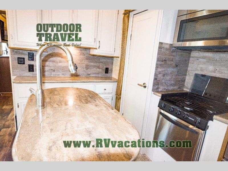 To the left of the entrance there is a slide with a free-standing dinette. On the opposite side of the kitchen you will find a slide with a pantry, three burner range, microwave, and refrigerator. In the middle of the kitchen there is an island with a double kitchen sink.