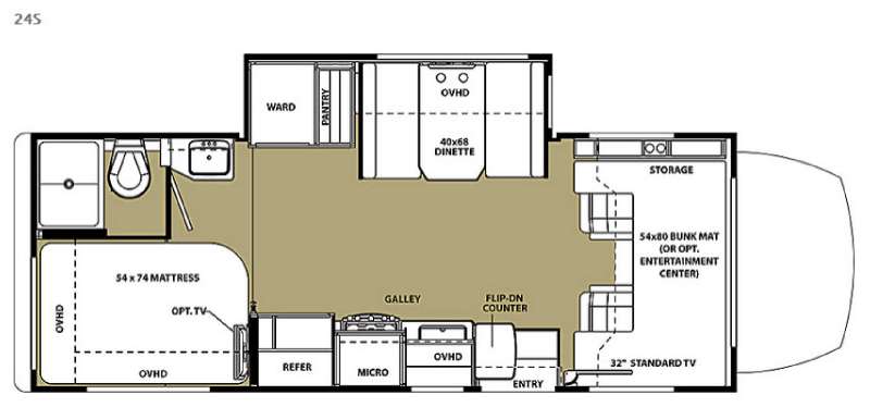 Above the cab you will find a bunk mat, or you can choose an optional entertainment center. In the corner of the motor home there is also a standard TV.