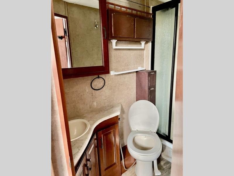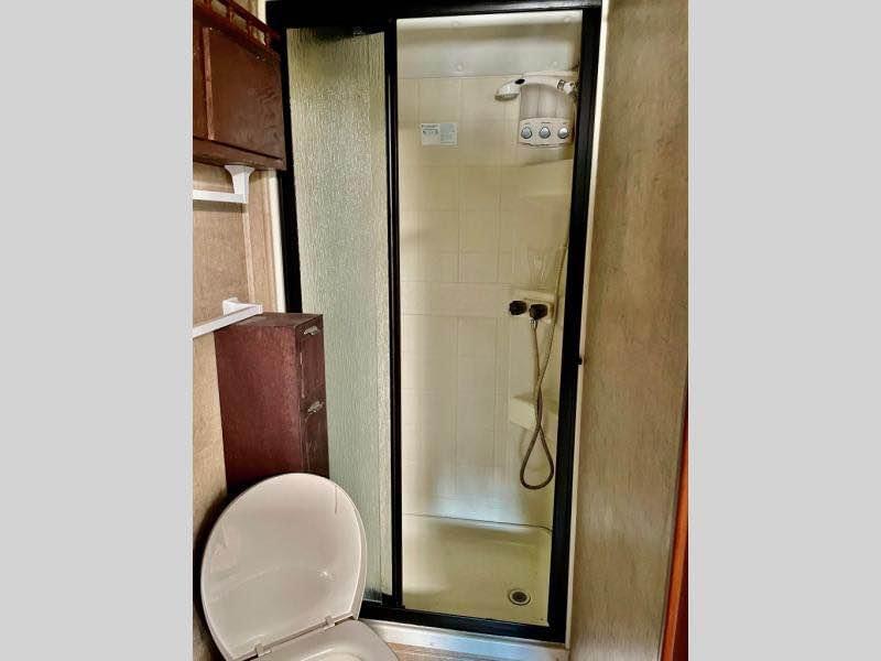 As you head toward the rear of the motor home you will find the bathroom in the corner. Just outside of the bathroom area there is a sink. Inside the bathroom you will find a toilet and shower.