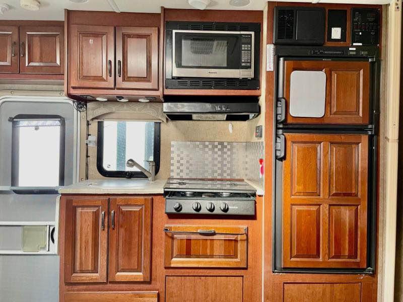 As you enter the motor home, to the left there is a flip-on counter, sink, range, microwave, and refrigerator. The opposite side of the motor home home has a slide with a dinette, pantry, and wardrobe.