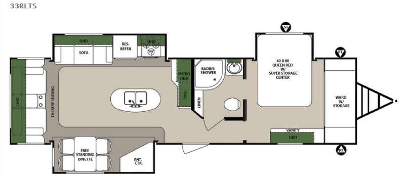 To the left of the entrance there is a slide with an entertainment center and a free-standing dinette. On the opposite side of the trailer the slide has a sofa, refrigerator, and three burner range. Along the rear of the trailer you will find theater seating, cup holders, and an overhead cabinet. In the middle of the kitchen there is an island with a double kitchen sink.