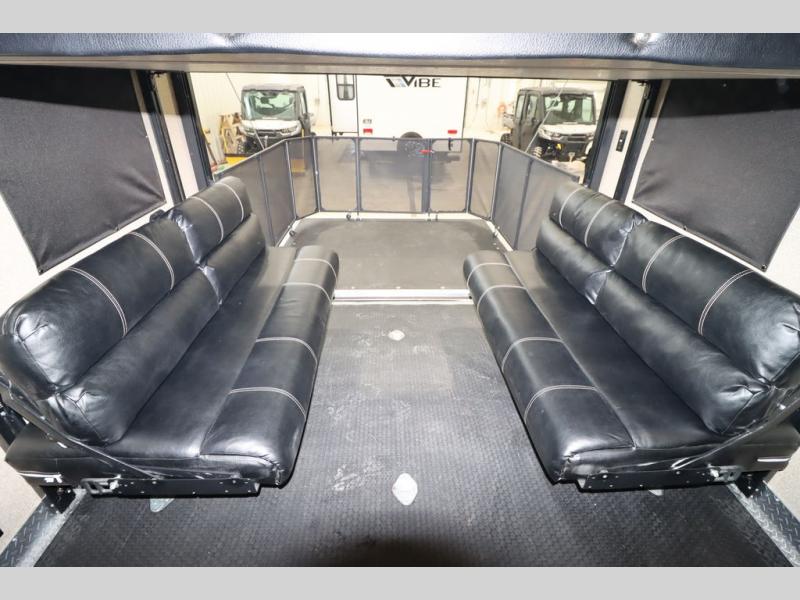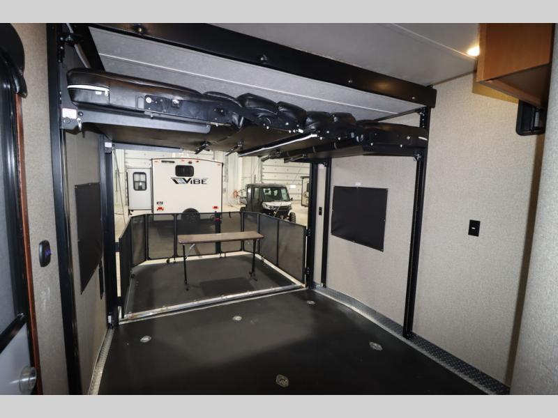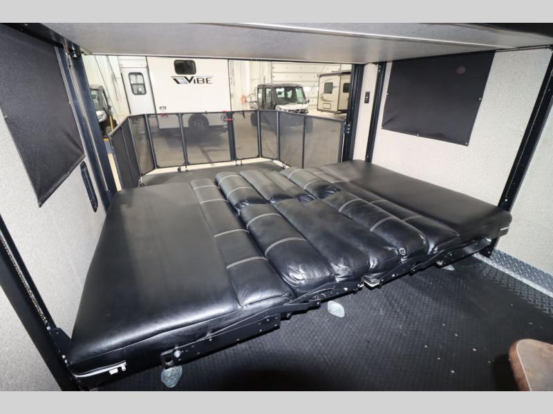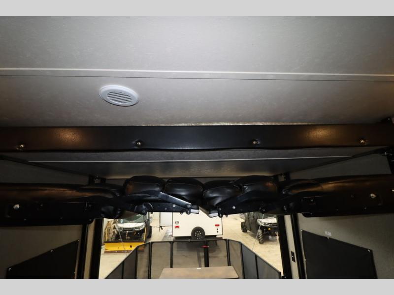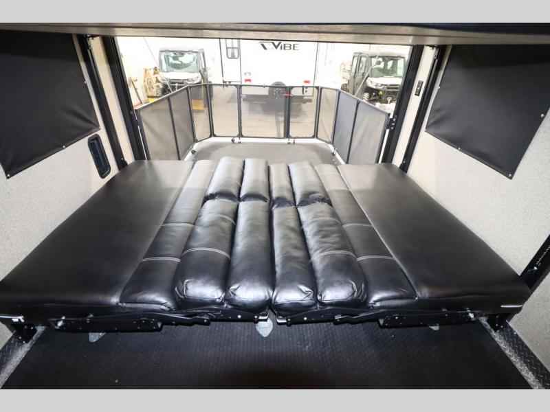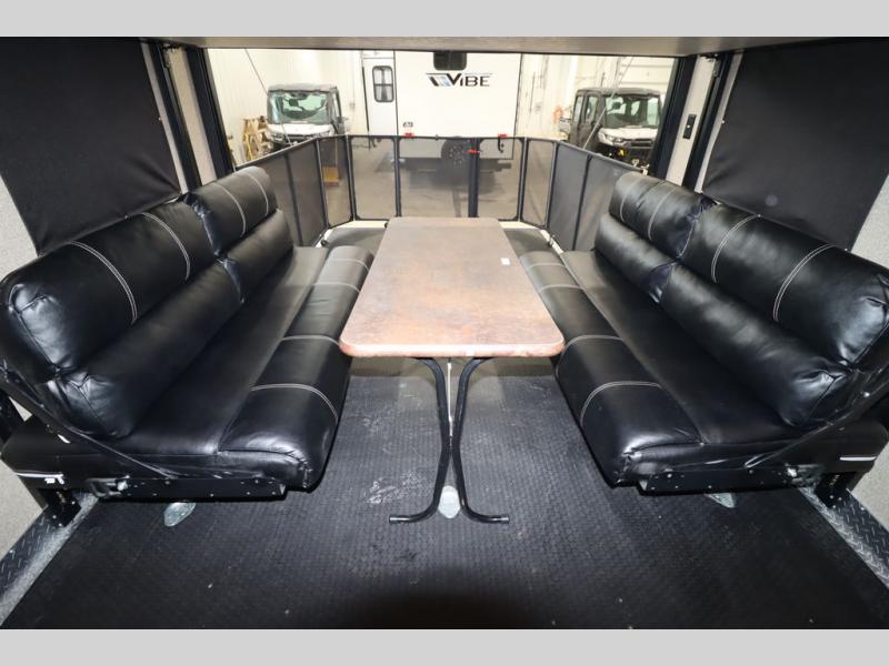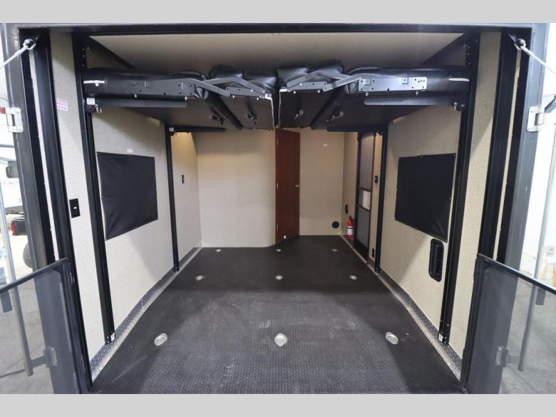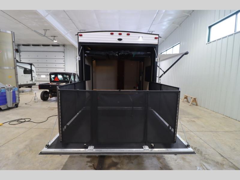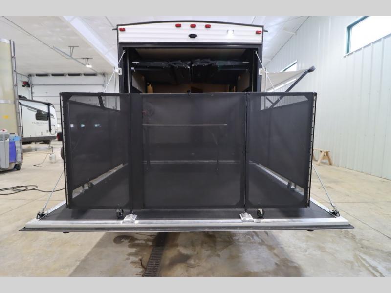 The rear of the travel trailer offers a large ramp door for easy loading and unloading all your toys. In the cargo area, there are dual opposing flip-up sofas and a free standing table. Plus there is a second entry into the trailer straight into the cargo area for quick access to your toys.