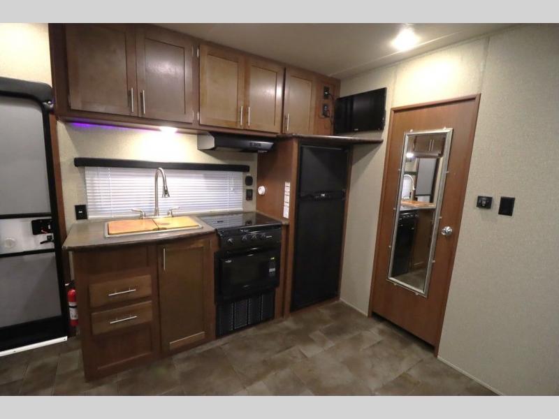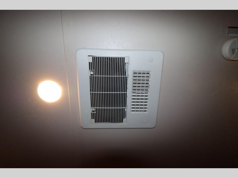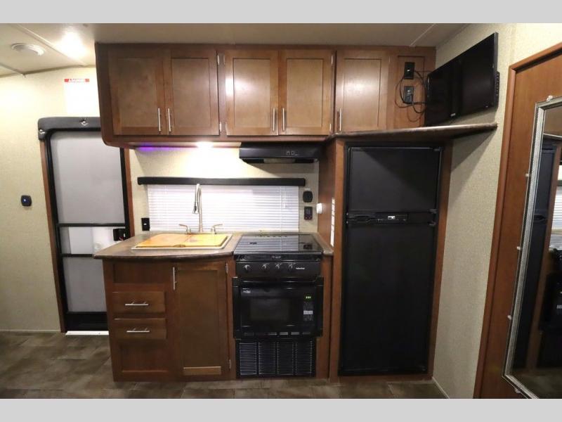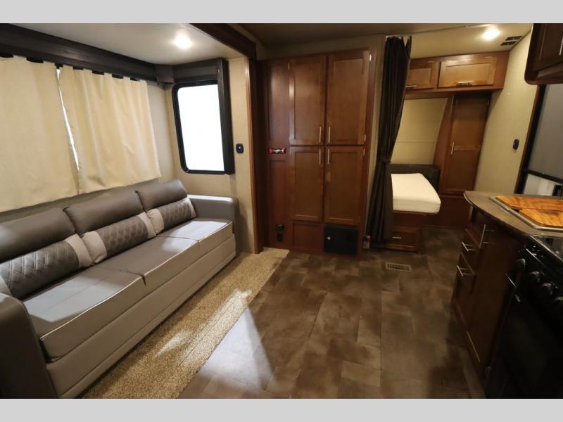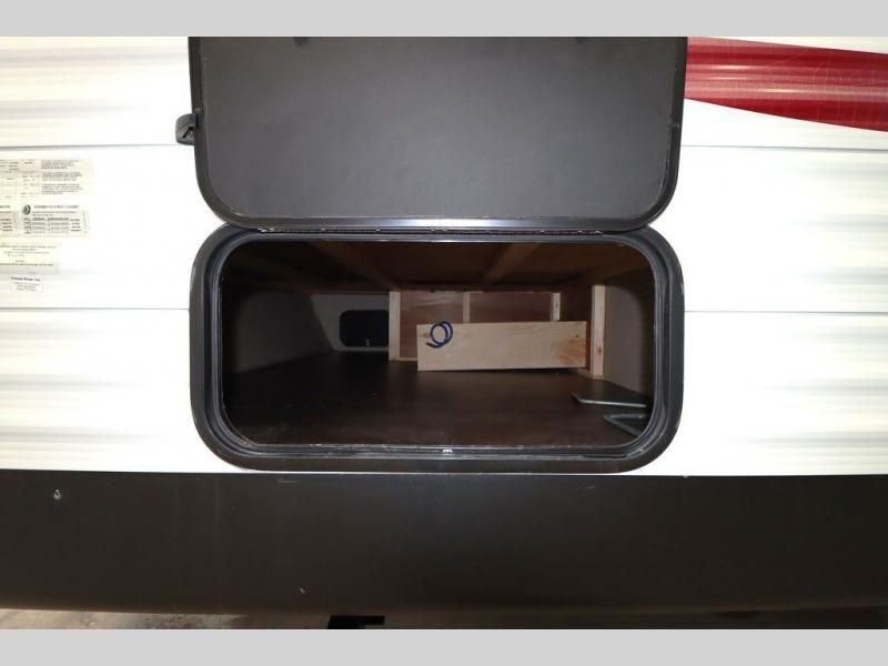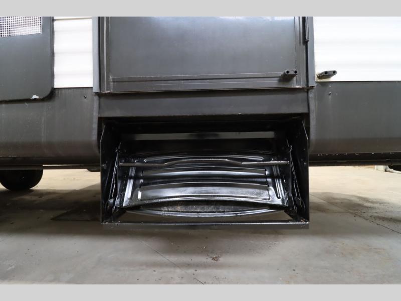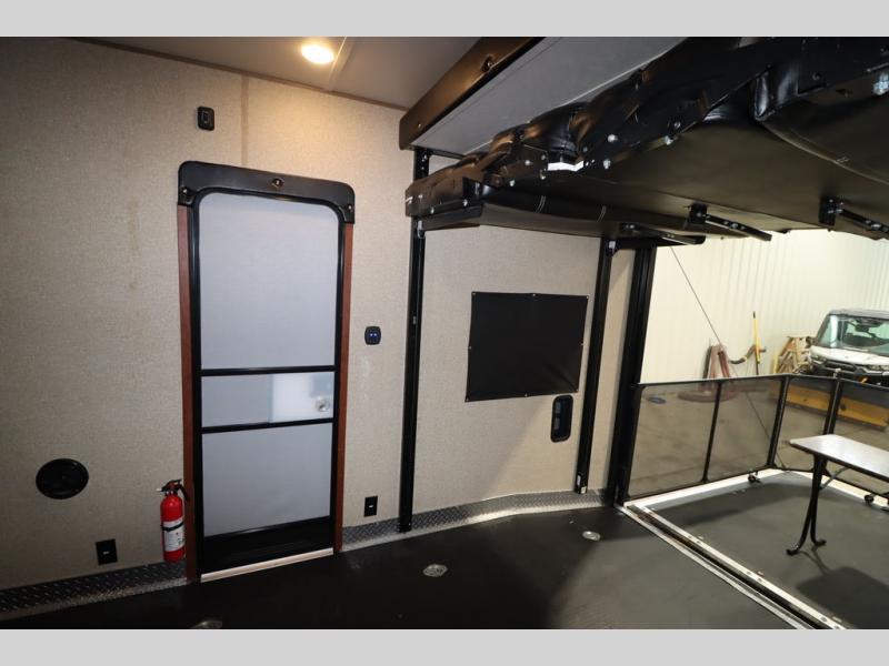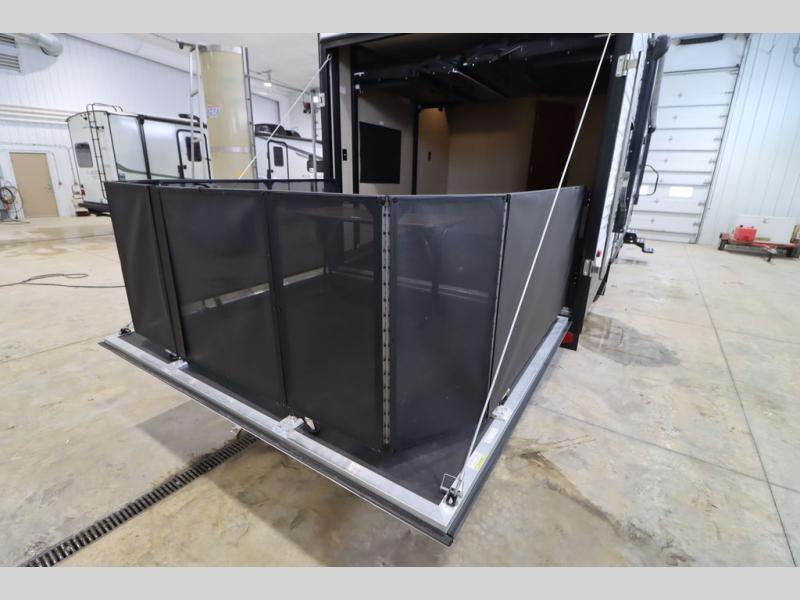 The rear of the travel trailer offers a large ramp door for easy loading and unloading all your toys. In the cargo area, there are dual opposing flip-up sofas and a free standing table. Plus there is a second entry into the trailer straight into the cargo area for quick access to your toys.