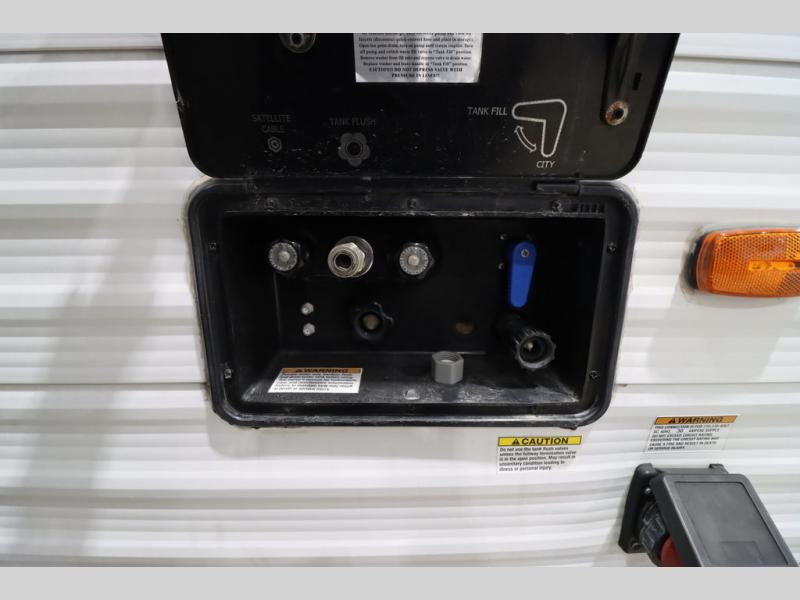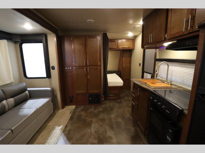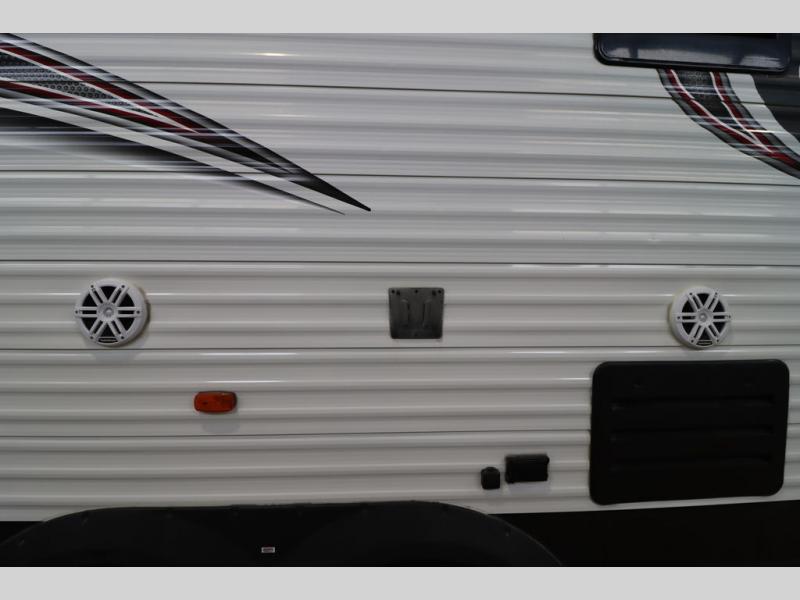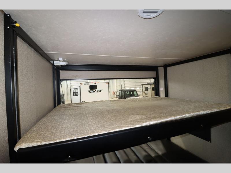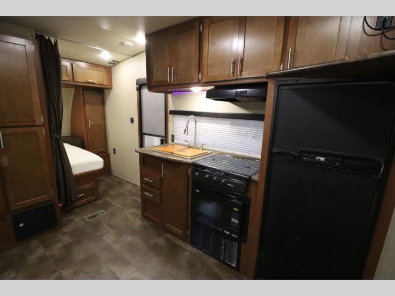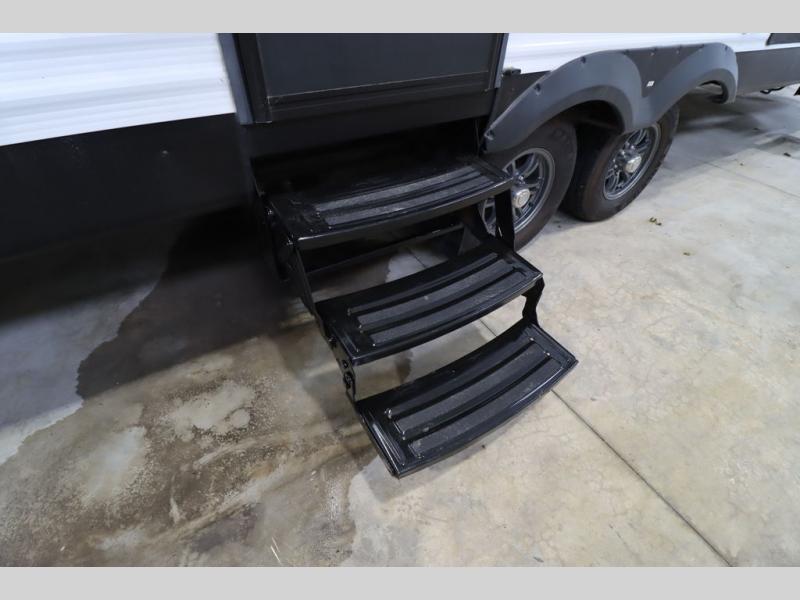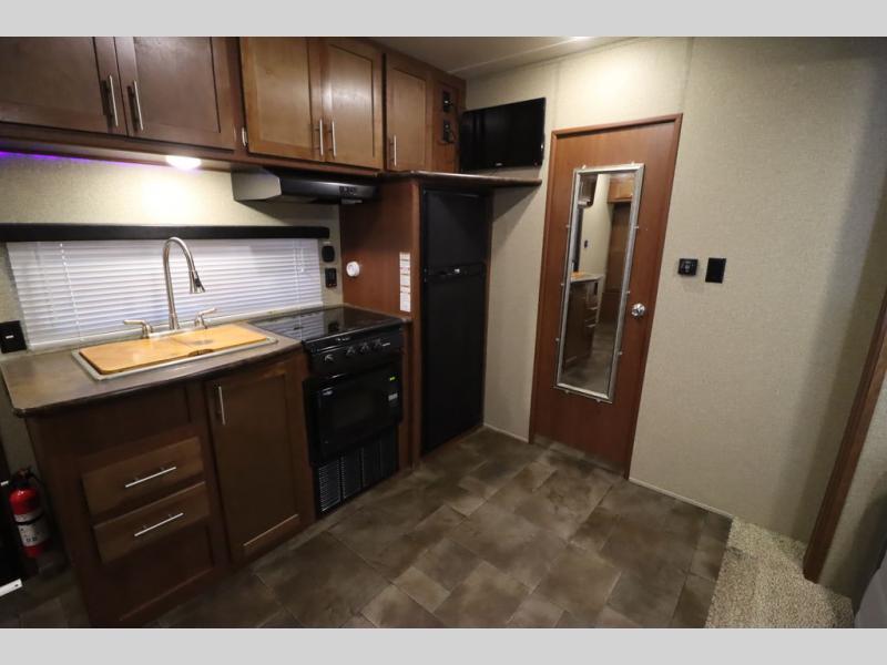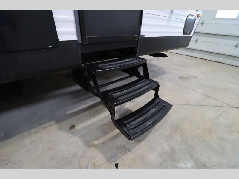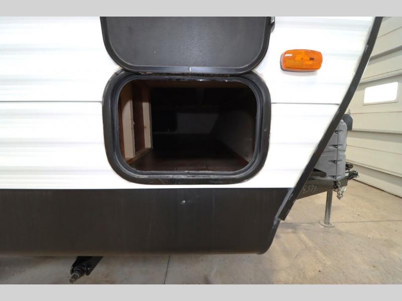 The rear of the travel trailer offers a large ramp door for easy loading and unloading all your toys. In the cargo area, there are dual opposing flip-up sofas and a free standing table. Plus there is a second entry into the trailer straight into the cargo area for quick access to your toys.