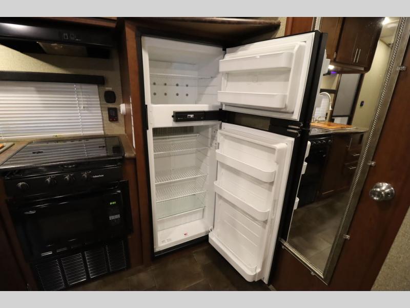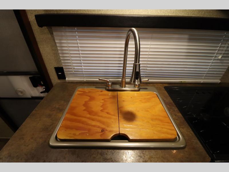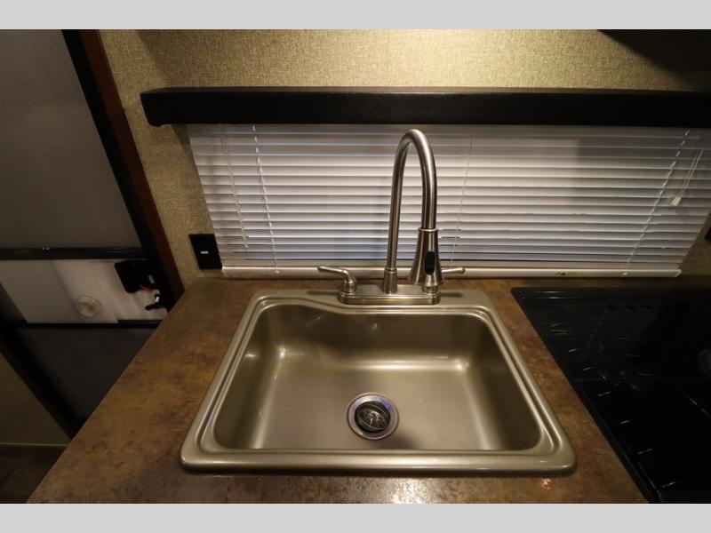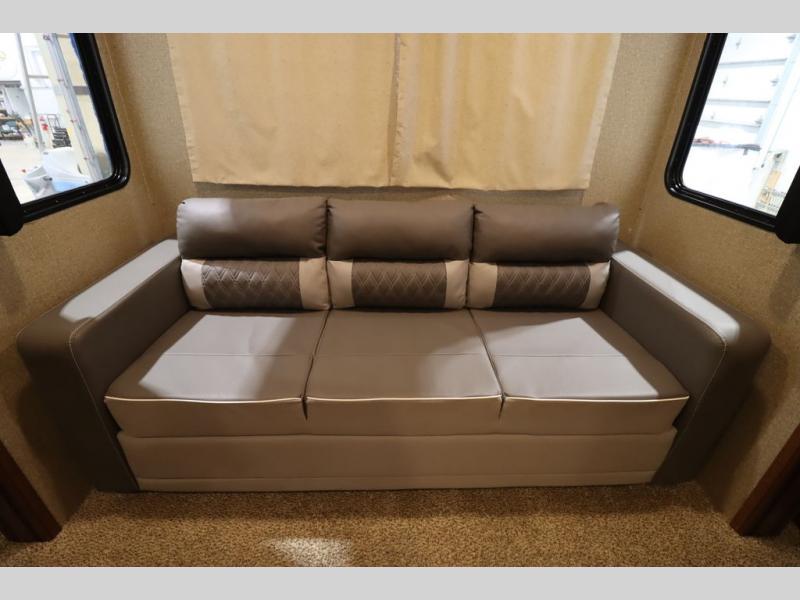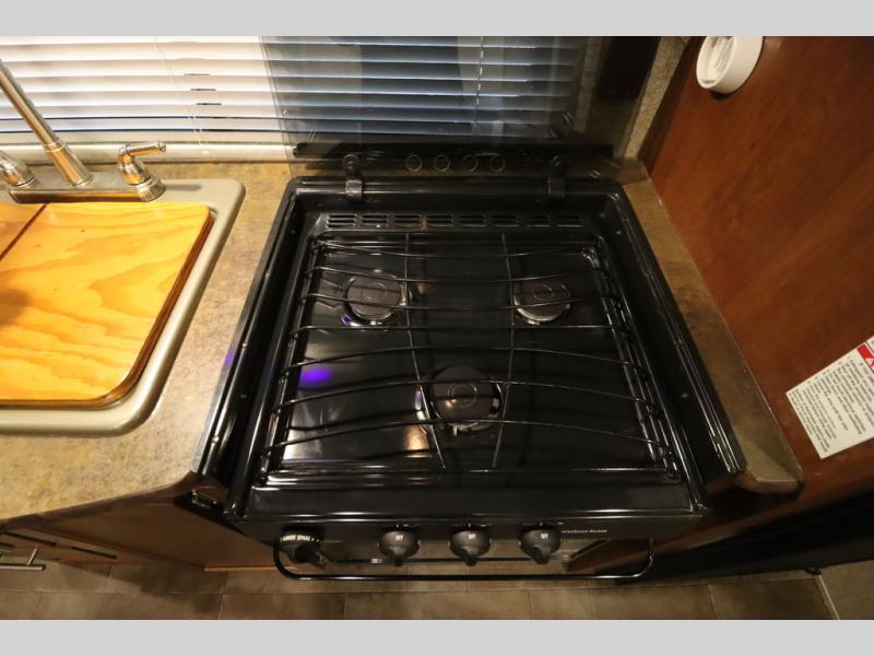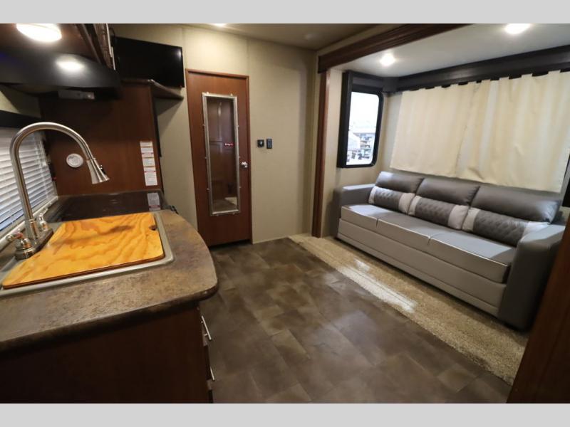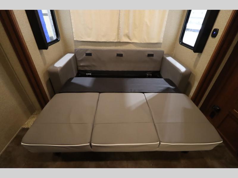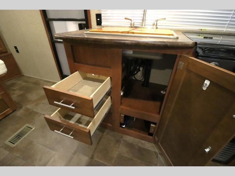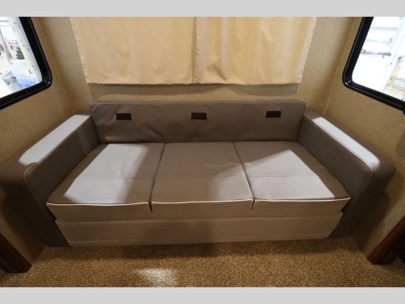 The kitchen offers a refrigerator, three burner range, microwave, and double kitchen sink for making any camp meal. On the opposite side you will find a u-shaped dinette/sofa slide out for dining or relaxing. In the corner is a large pantry for your non-perishables.