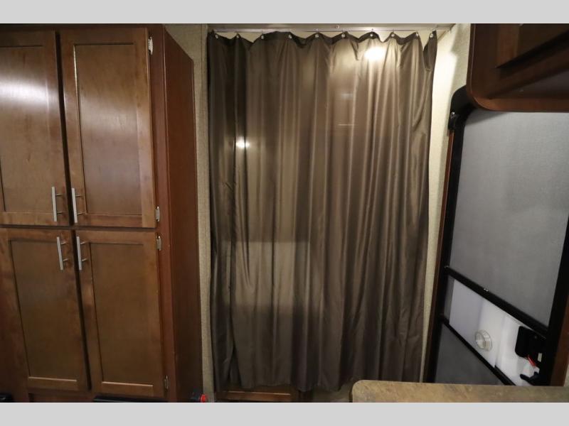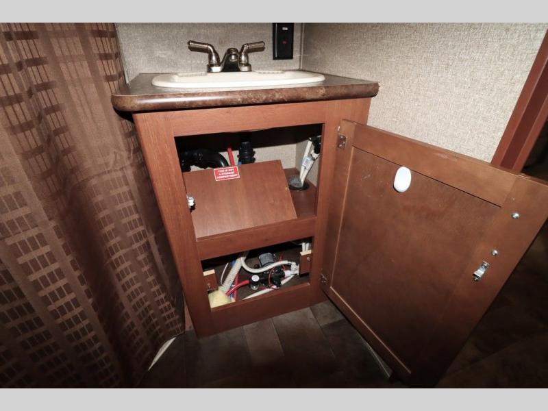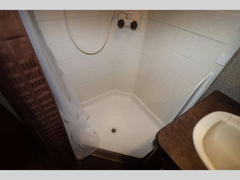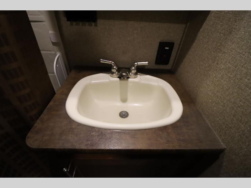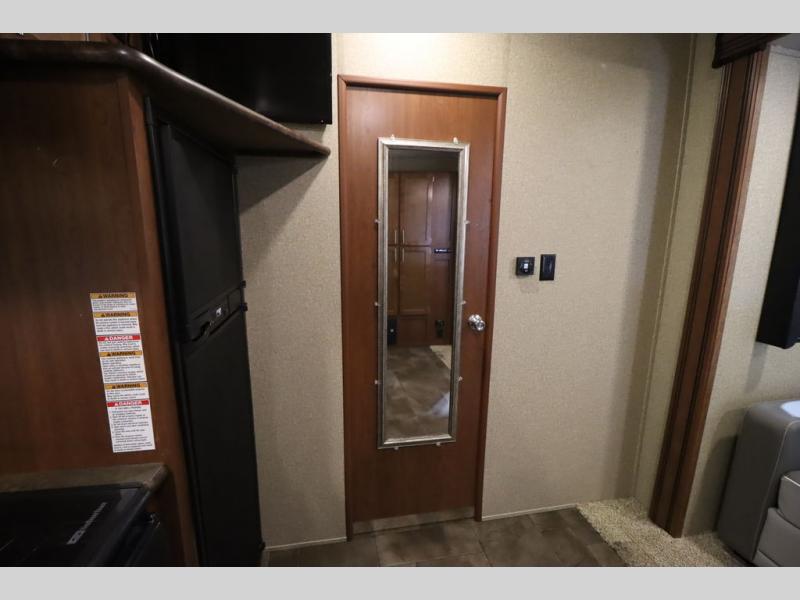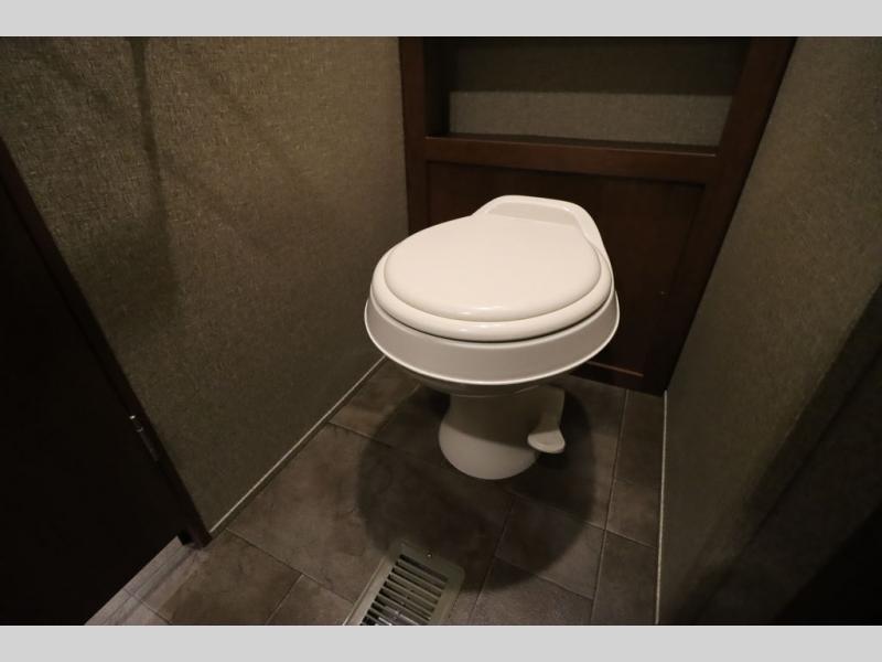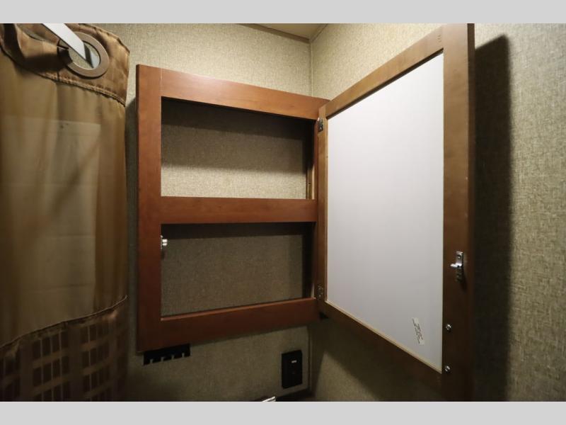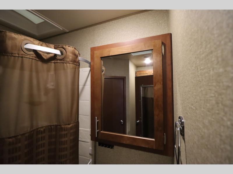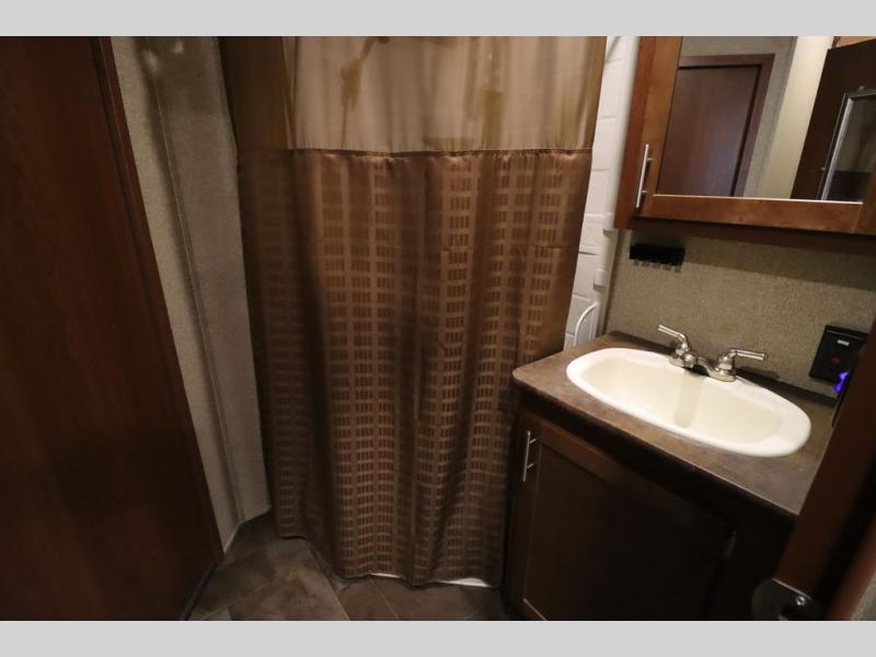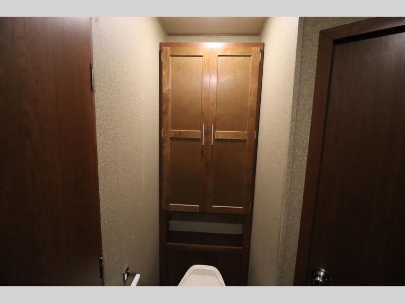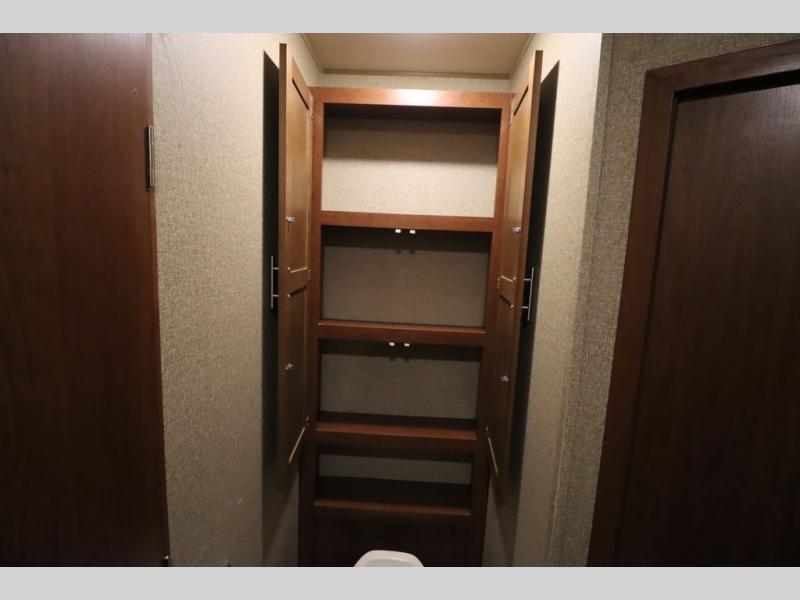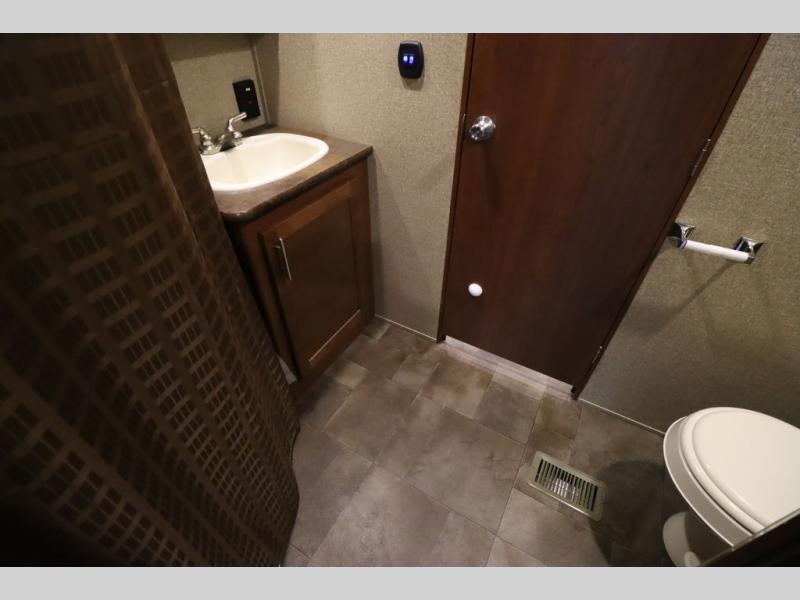 As you leave the cargo area and enter into the main living area of the travel trailer, you will notice that there is a door, which separates the cargo area from the rest of the trailer. You will enter the walk-thru bathroom including a neo-angle shower and sink with a medicine cabinet on one side, and a private toilet area with a linen cabinet is on the opposite side.