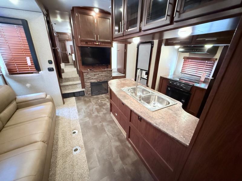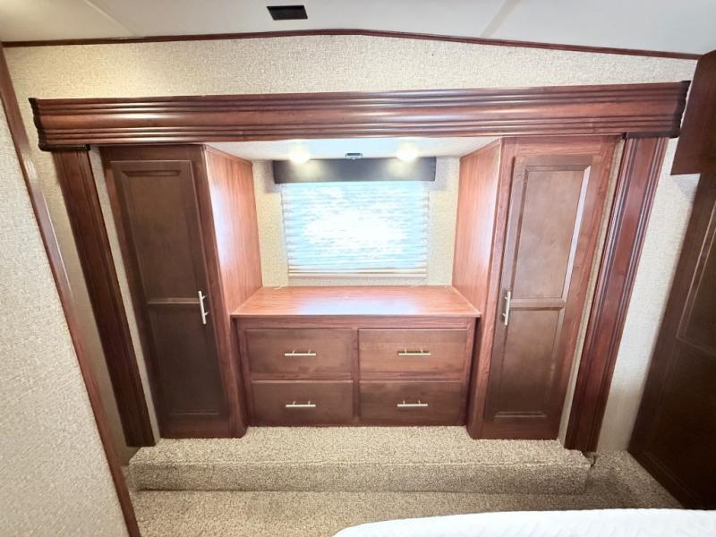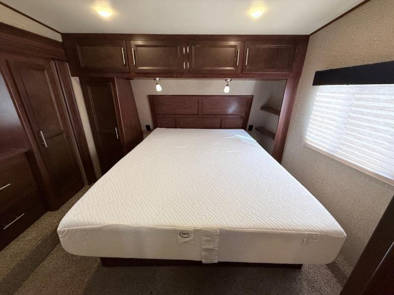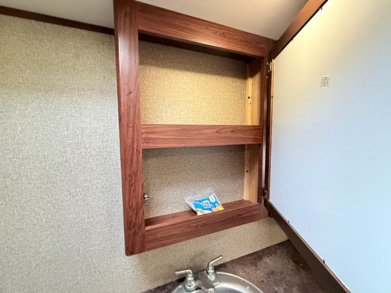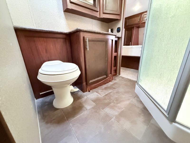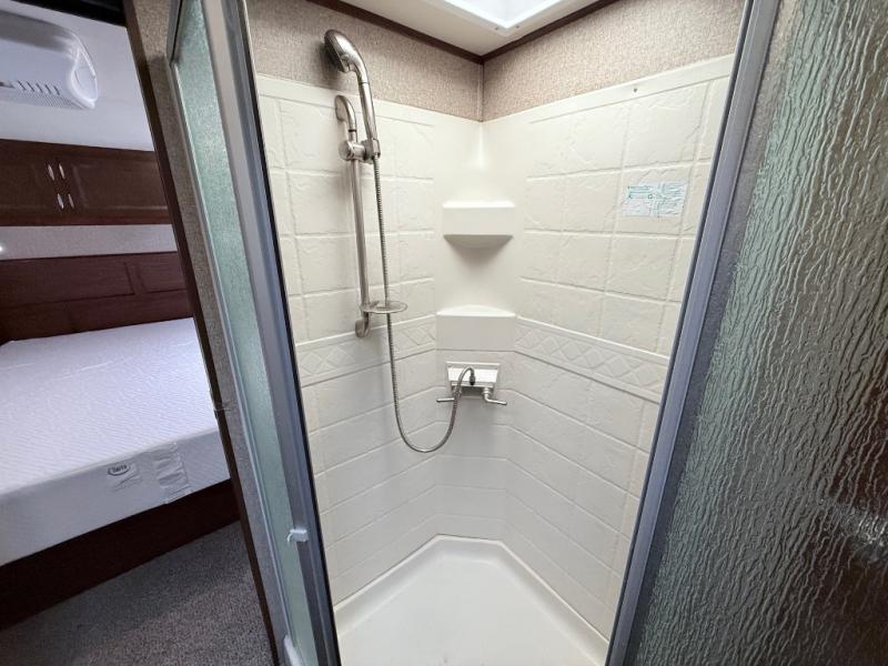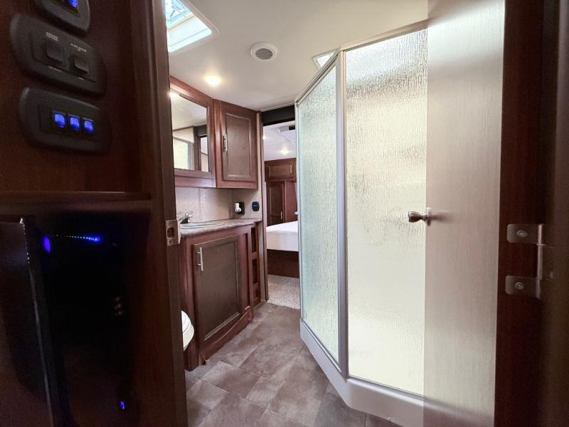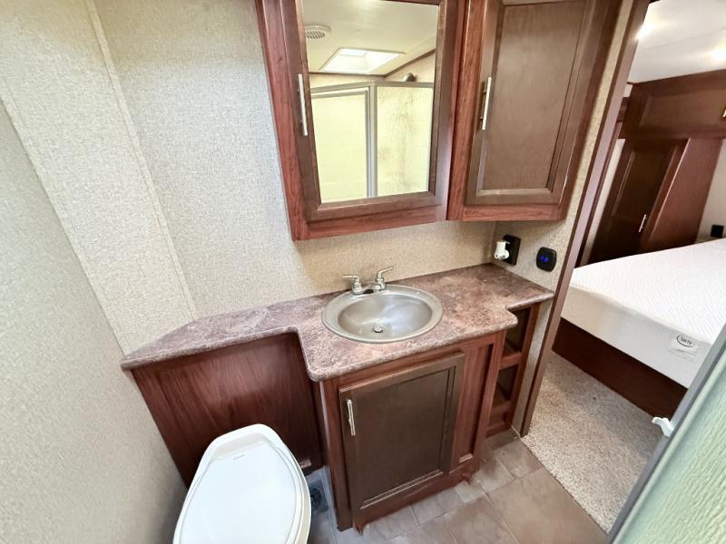 There are two sets of stairs in this fifth wheel. The first set of stairs will lead you into the bathroom. Inside the bathroom is a corner shower, toilet, sink, and medicine cabinet. Plus there is a sliding private door into the bedroom.