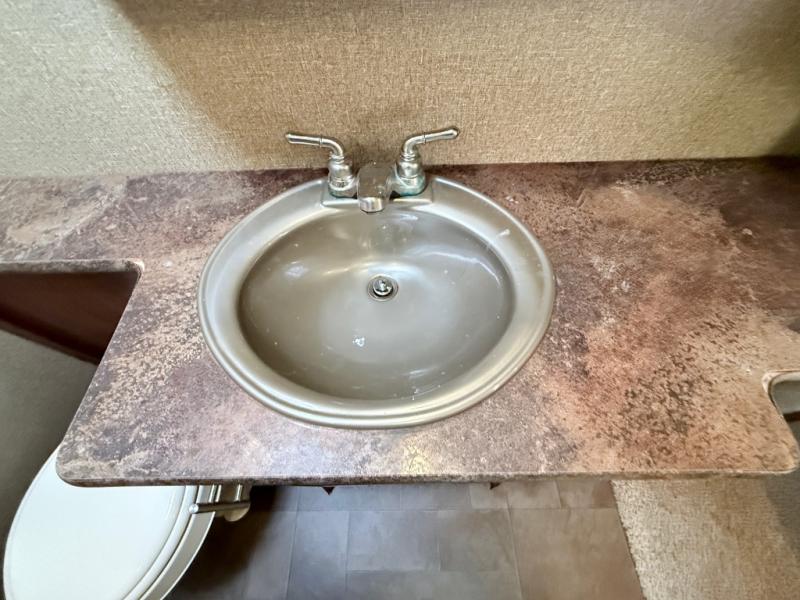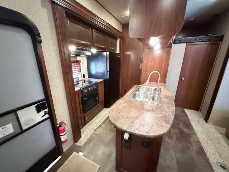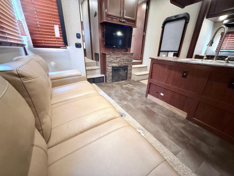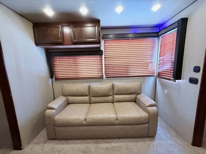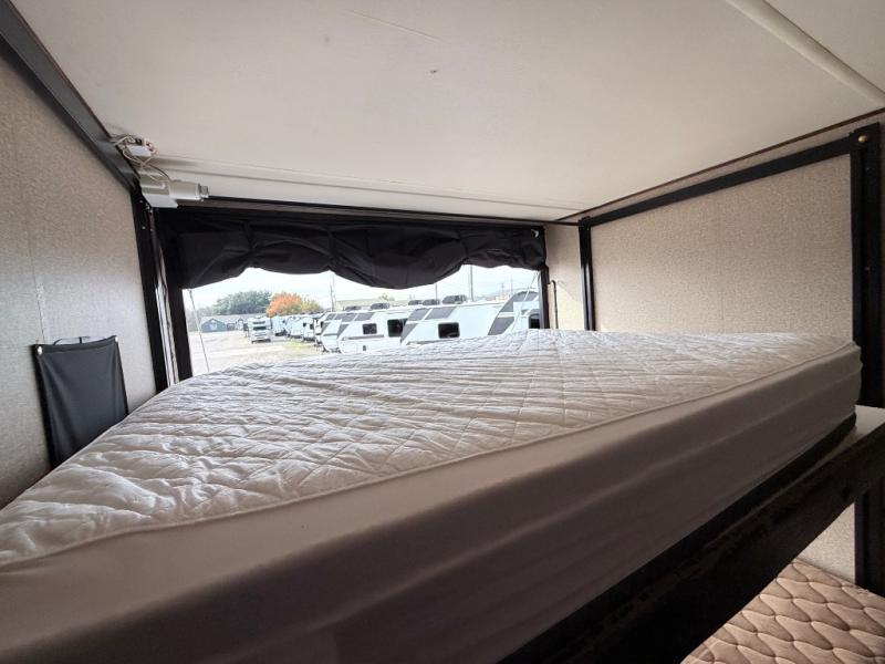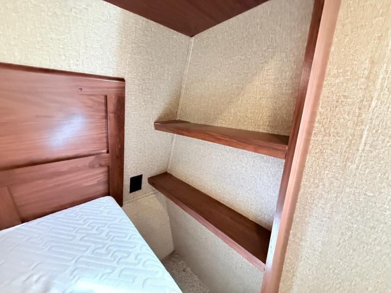 In the kitchen and living area you will find two slides. The first slide has a refrigerator, three burner range, and microwave. You are sure to enjoy the pantry to store your non-perishables, and the kitchen peninsula with a double sink, overhead storage, and lots of counter space. The other slide offers a sofa with recliners. You can relax on the sofa and enjoy the entertainment center and fireplace on the interior wall of this space.