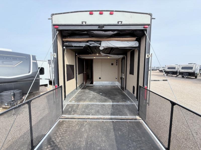 In the cargo area there is plenty of room for you off road toys and easy loading and unloading with the spring assist ramp. You will also find dual rollover sofas and free standing table along the rear wall. A side man door makes getting to your toys easy. A loft is above the cargo area with access from the main living room allowing more sleeping space for more friends!