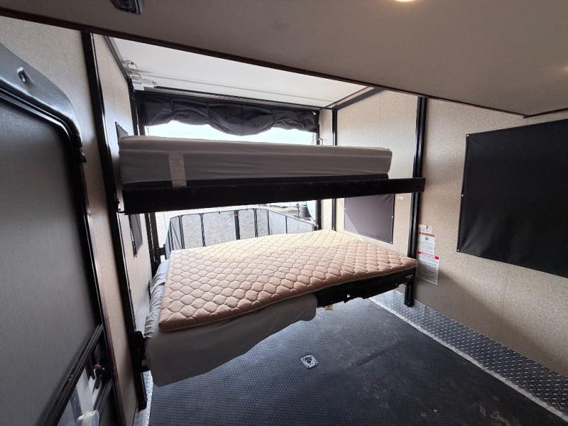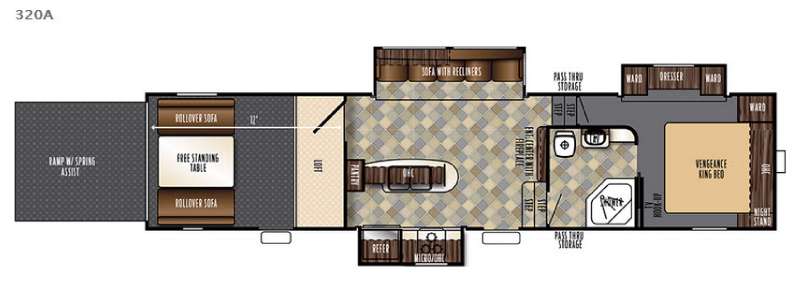 If you are looking for a toy hauler fifth wheel with plenty of space, then take a closer look at the 320A laminated Super Sport Vengeance by Forest River. From the TRIPLE slides, 12' cargo area, king size bed, dual entry, and loft, you will keep finding features that you can't live without!