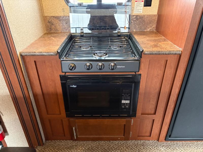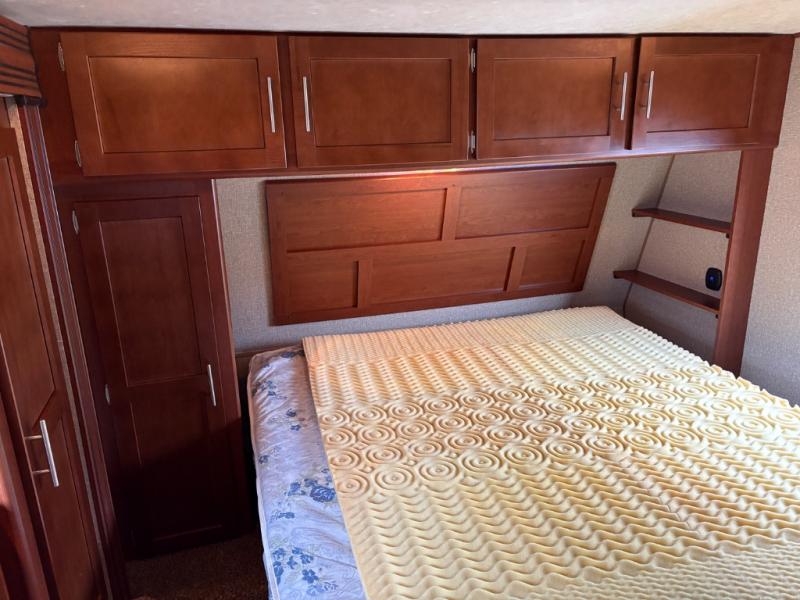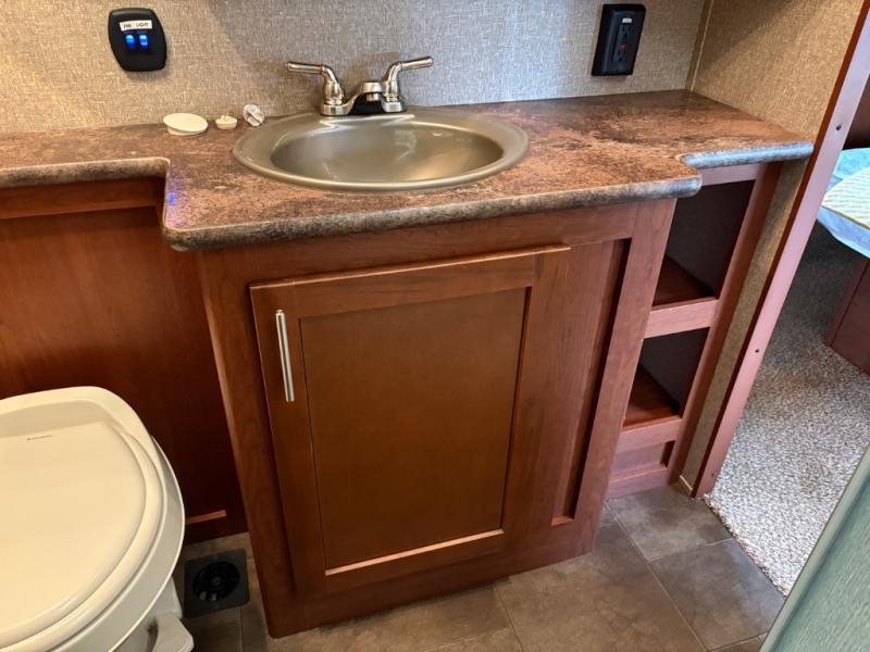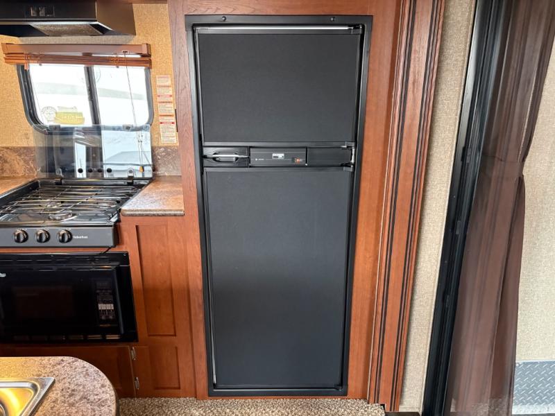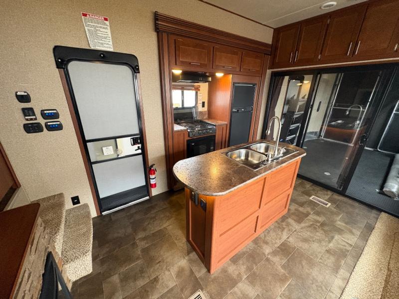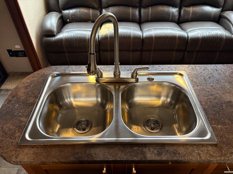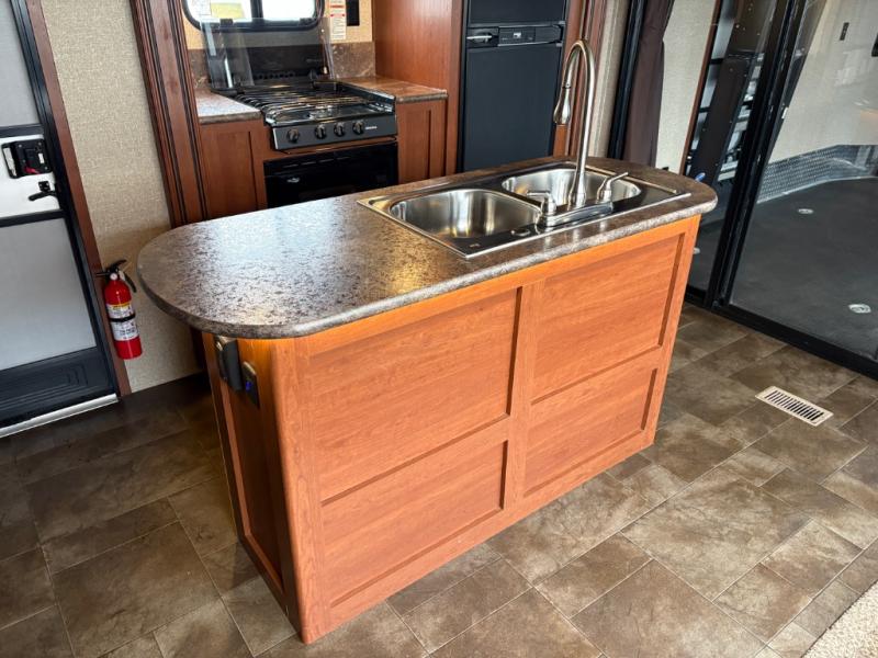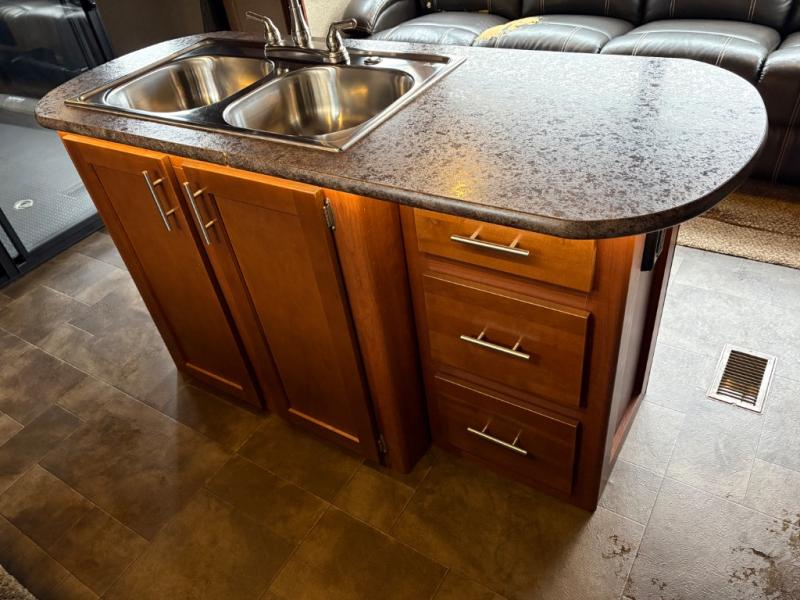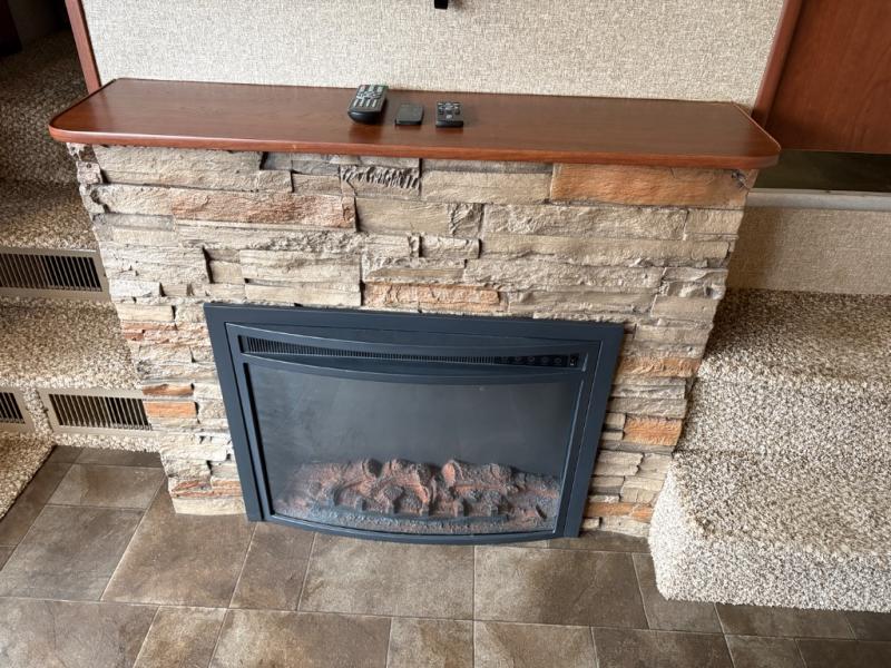 In the kitchen and living area you will find two slides. The first slide has a refrigerator, three burner range, and microwave. You are sure to enjoy the pantry to store your non-perishables, and the kitchen peninsula with a double sink, overhead storage, and lots of counter space. The other slide offers a sofa with recliners. You can relax on the sofa and enjoy the entertainment center and fireplace on the interior wall of this space.