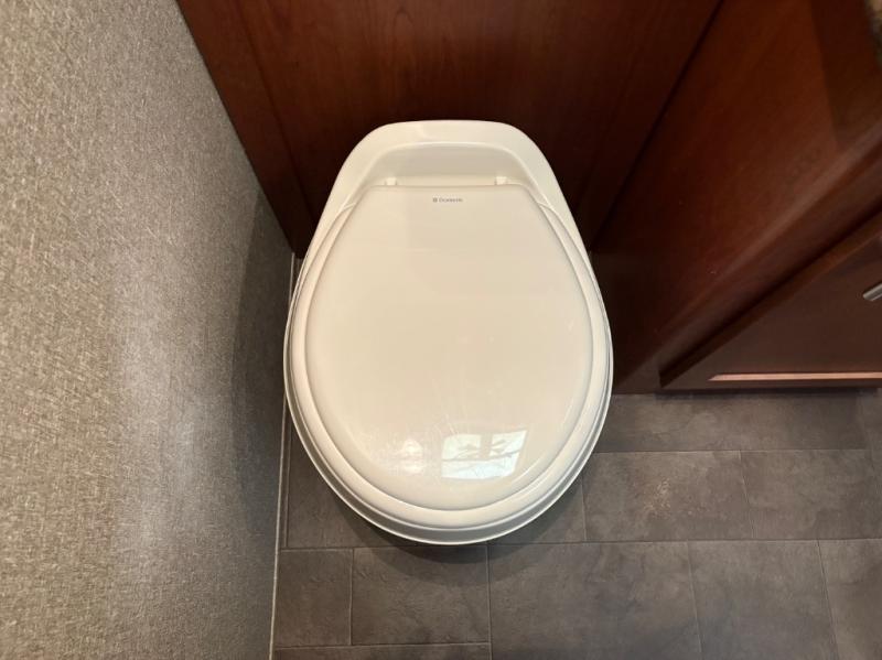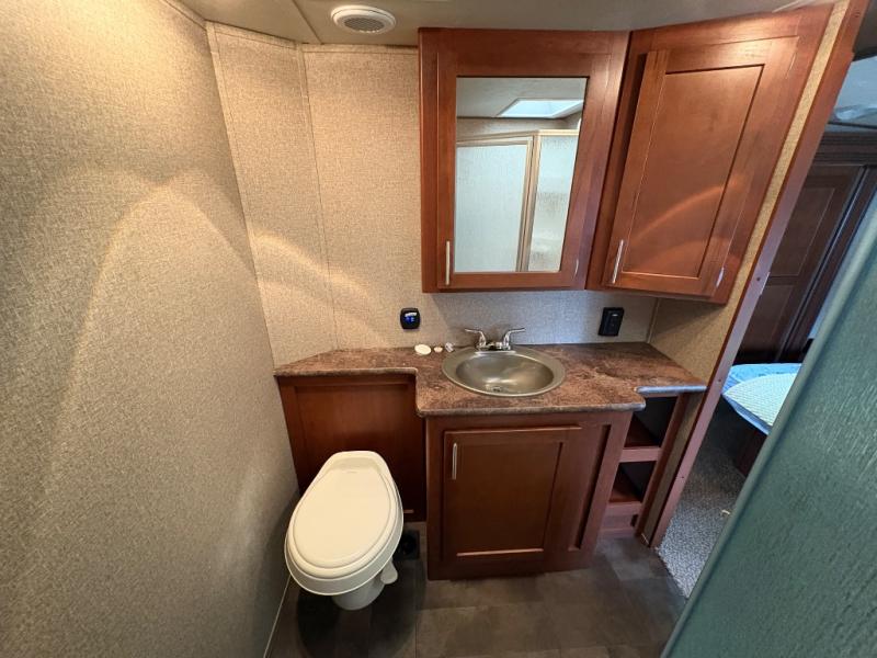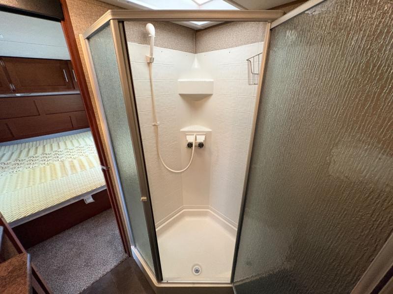 There are two sets of stairs in this fifth wheel. The first set of stairs will lead you into the bathroom. Inside the bathroom is a corner shower, toilet, sink, and medicine cabinet. Plus there is a sliding private door into the bedroom.