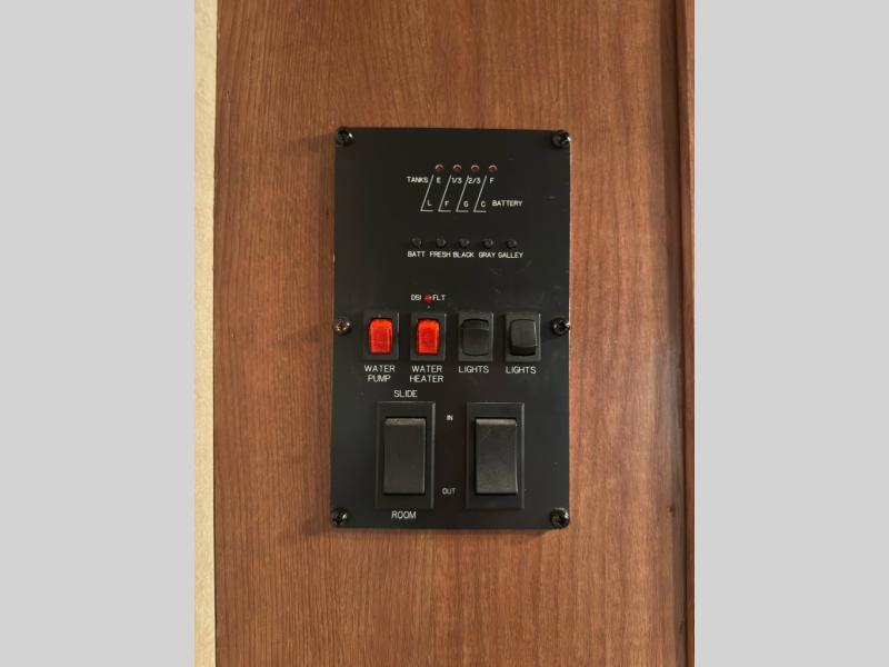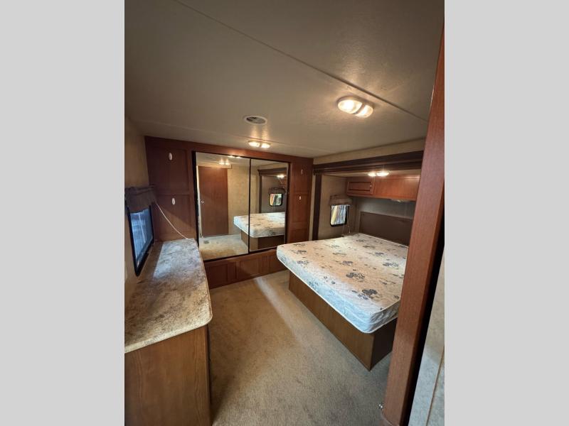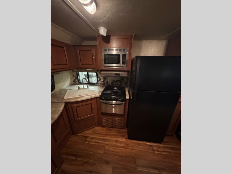 There are two entrances on this model, the front entrance will take you into the living and kitchen area. The rear entrance will lead you into the bedroom. Starting in the front of the model, to the right of the entrance is a lounge chair, pantry, refrigerator, three burner range, microwave, and kitchen sink. There is plenty of counter space which makes food preparation a breeze. Along the opposite side of the travel trailer is a slide with a sofa and dinette. You can relax in the lounge chair, at the sofa or dinette and enjoy the entertainment center.