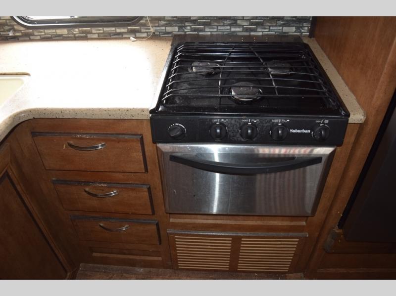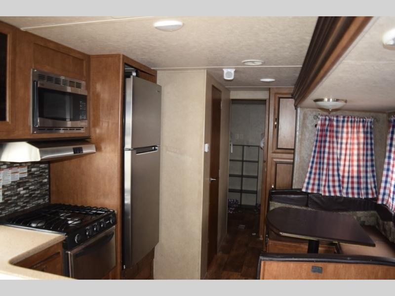 The main living area offers a slide with a sofa and a u-dinette. Next to the slide you will find a nice size pantry. On the opposite side of the trailer you will find a double kitchen sink, three burner range, microwave, and refrigerator. Along the front of the living/kitchen area there is a swivel box for your enjoyment.