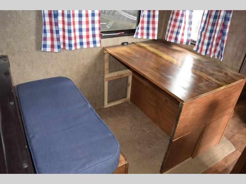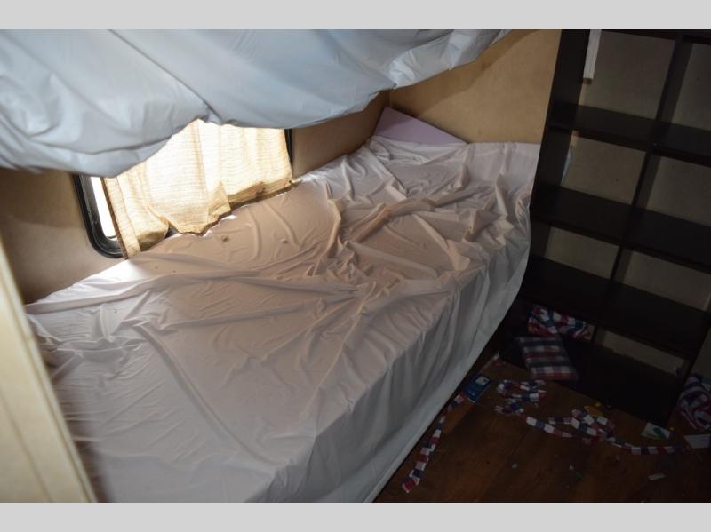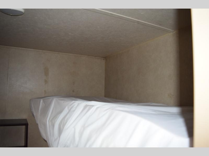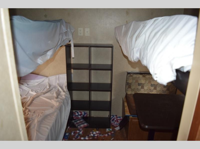 The rear bunk house has a dinette with a hinged bunk above. On the opposite side there is an upper bunk. Along the rear wall you will find two wardrobes.