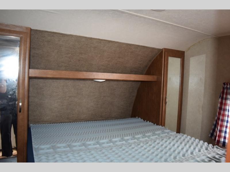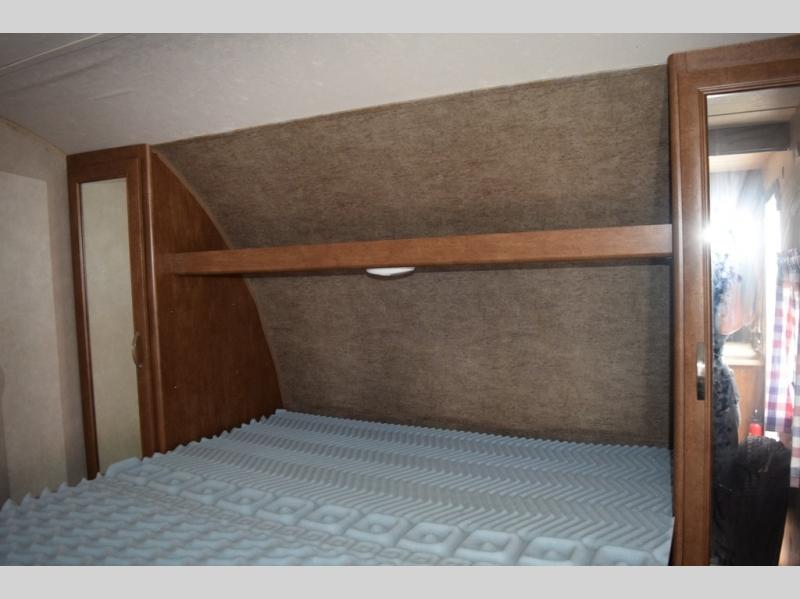 Stepping inside the trailer, to the right you will enter the front bedroom. There is a queen bed with wardrobes on either side of the bed, and a shelf above the bed.