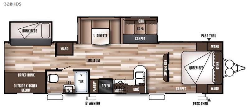 Inside the 32BHDS Wildwood travel trailer by Forest River you will find double slides and a rear bunk house which your kids will love!