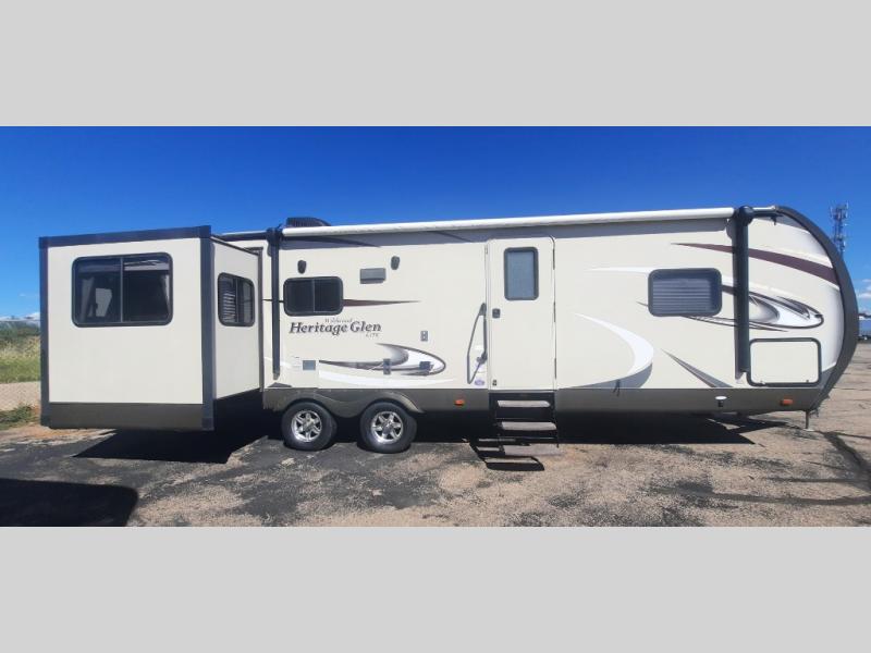 The Wildwood Heritage Glen 299RE travel trailer by Forest River offers a rear entertainment center and triple slides.