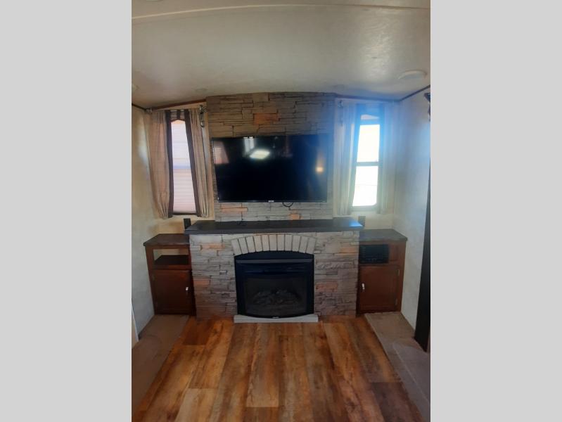 This Wildwood Heritage Glen travel trailer offers everything you need to enjoy spending time away from home. Model 299RE provides triple slide-outs for added interior space, a rear entertainment layout, and a front private bedroom with direct access to the full bath next door.