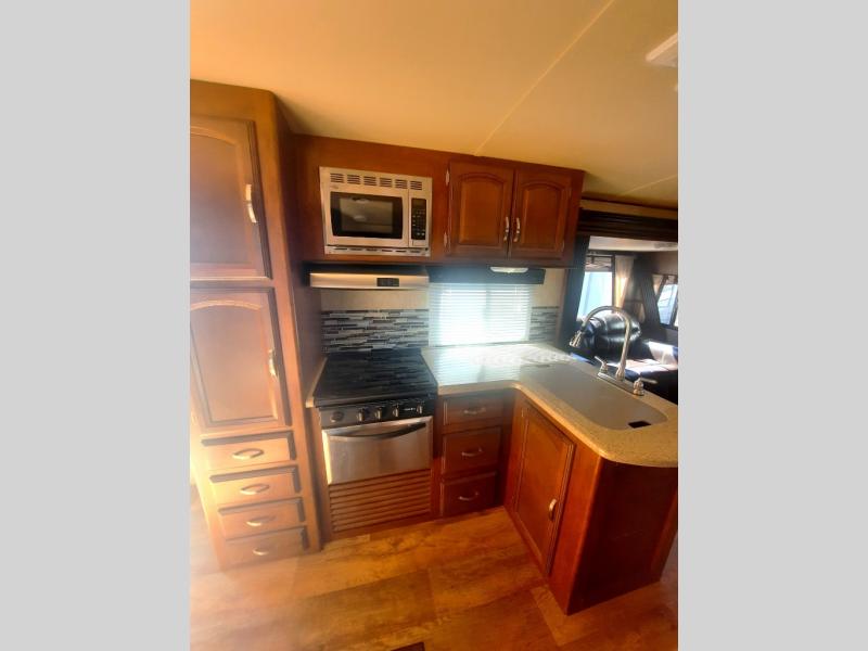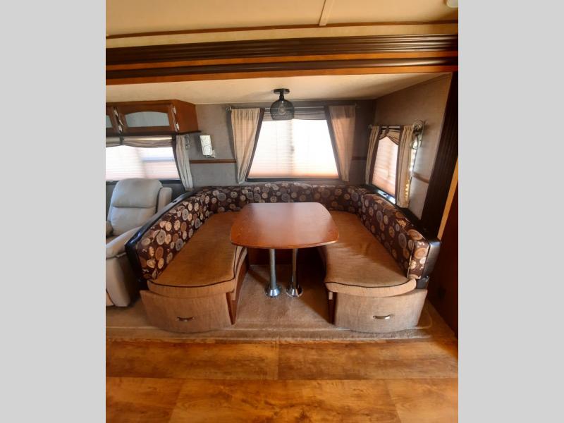There are plenty of overhead cabinets throughout the travel trailer, as well as a large exterior pass thru storage, and much more.