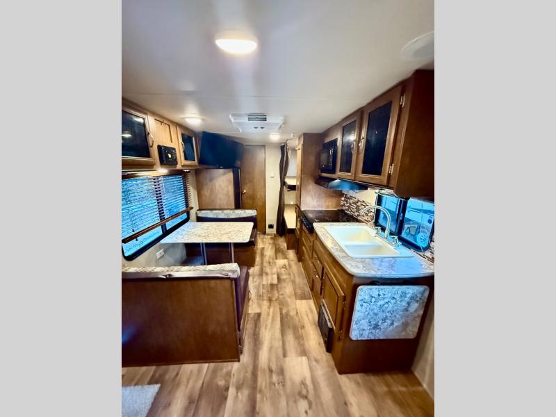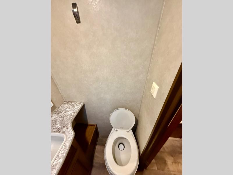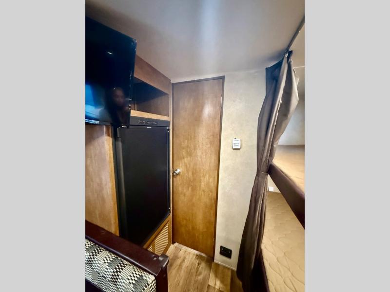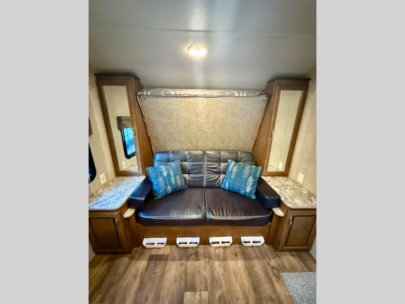 In the rear of this Wildwood unit you will enjoy a set of bunks for the kiddos, and on the opposite side there is a complete bath with toilet, tub/shower, and vanity with sink, plus medicine cabinet.