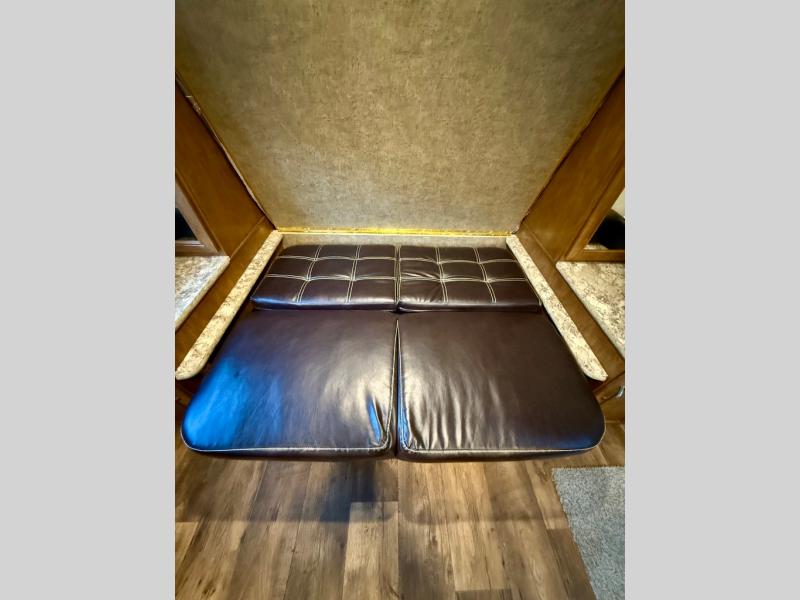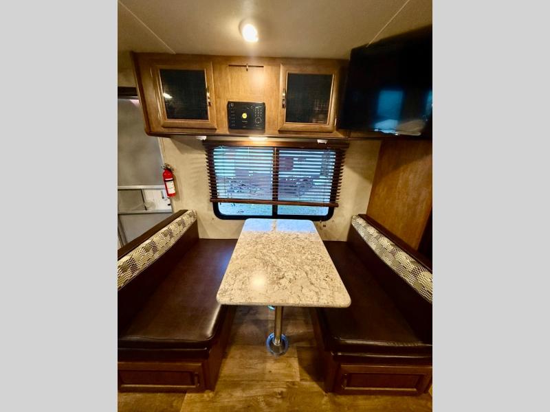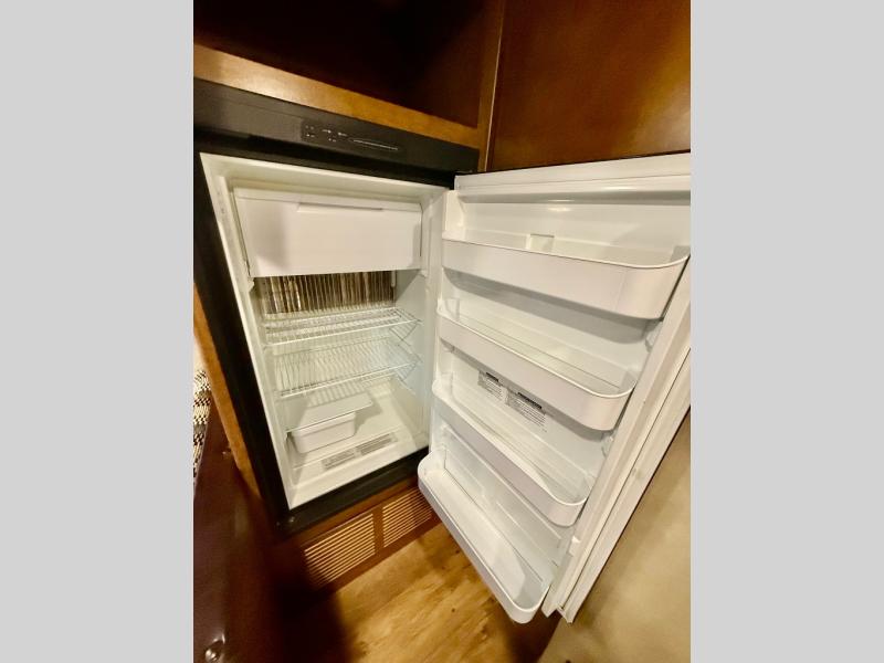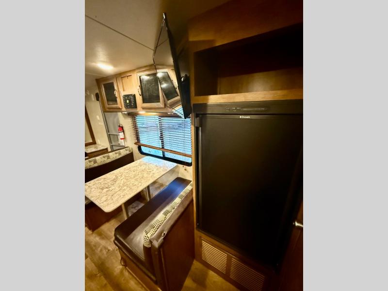 To the left find a booth dinette with overhead cabinet and TV. Along the opposite side is the kitchen which features a double sink, a three burner range with overhead microwave oven, and food pantry. The refrigerator is along the door side just beyond the dinette seating.