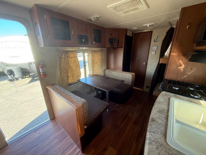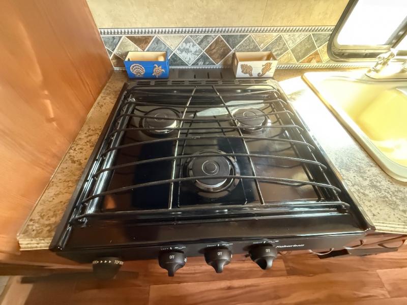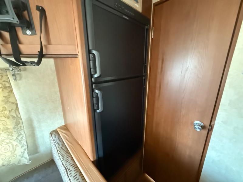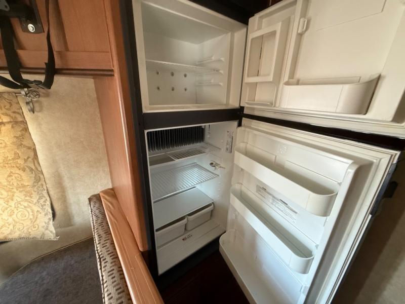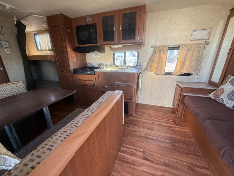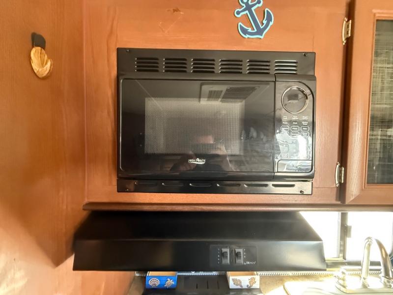 To the left find a booth dinette with overhead cabinet and TV. Along the opposite side is the kitchen which features a double sink, a three burner range with overhead microwave oven, and food pantry. The refrigerator is along the door side just beyond the dinette seating.