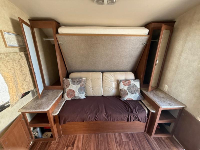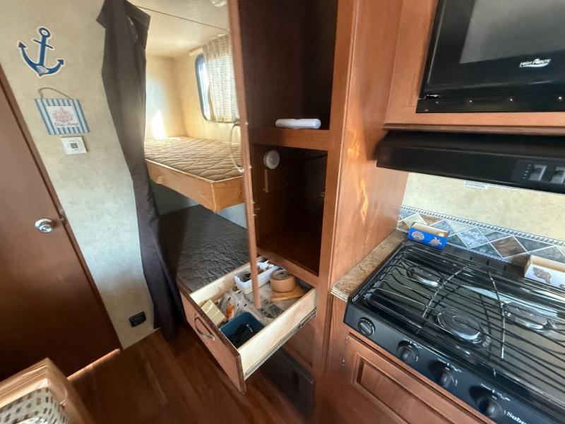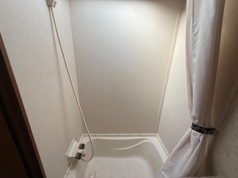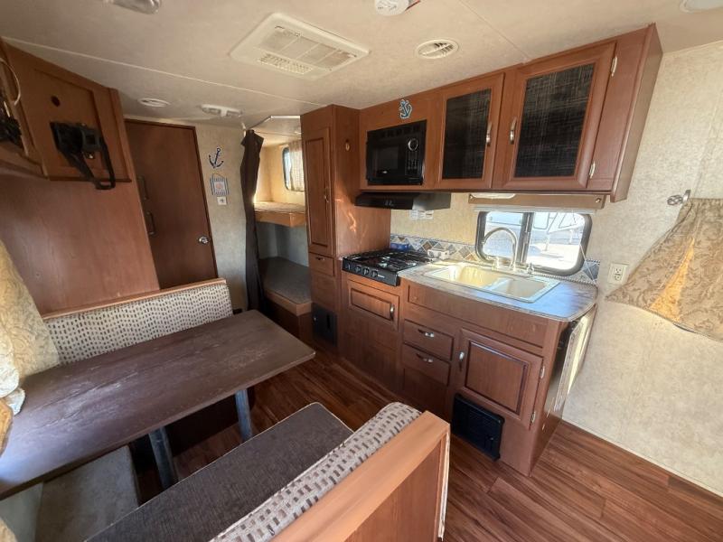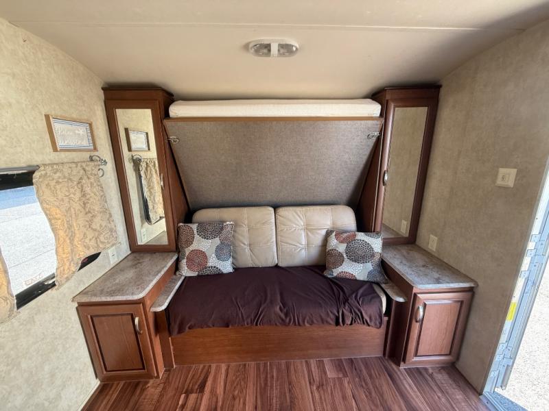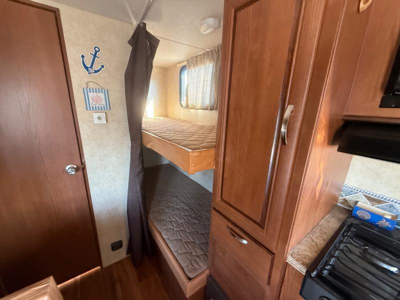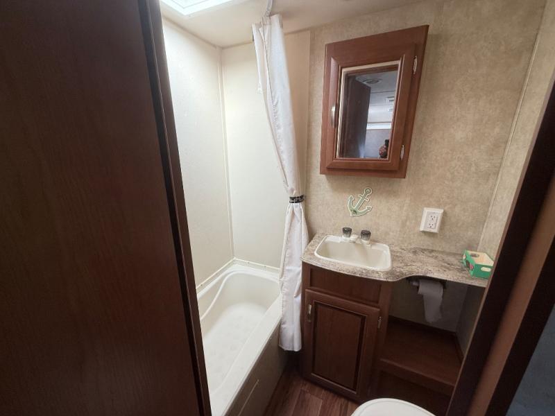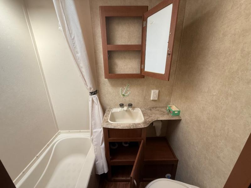 In the rear of this Wildwood unit you will enjoy a set of bunks for the kiddos, and on the opposite side there is a complete bath with toilet, tub/shower, and vanity with sink, plus medicine cabinet.