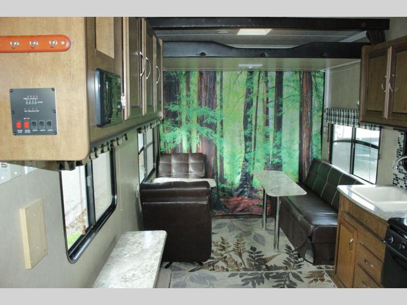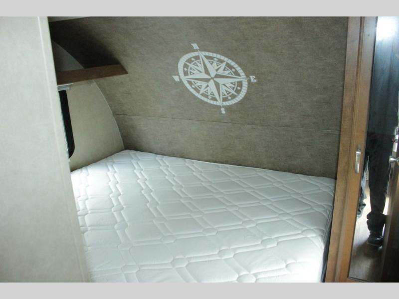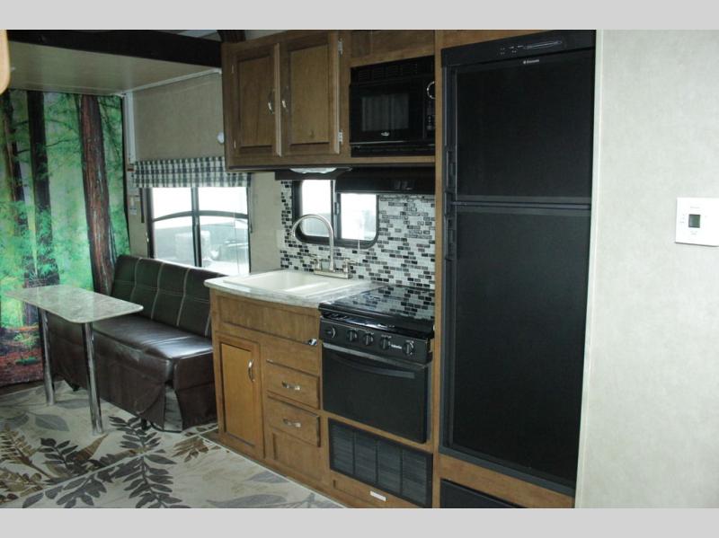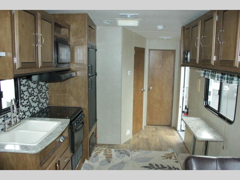 Cook up meals and snacks for your hungry crew in this Wildwood X-Lite kitchen along the road side featuring a double sink, a three burner cook-top with overhead microwave oven, and a refrigerator for all of your perishables. In the kitchen area you will have a width of 67" from the stove to the curb side wall. There are also overhead cabinets along the curb side wall just inside the main entry door for all of your gear and belongings.