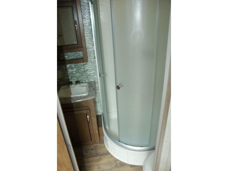 A convenient bathroom is located directly across from the entrance. Inside you will find a corner radius shower, a toilet, and sink.
